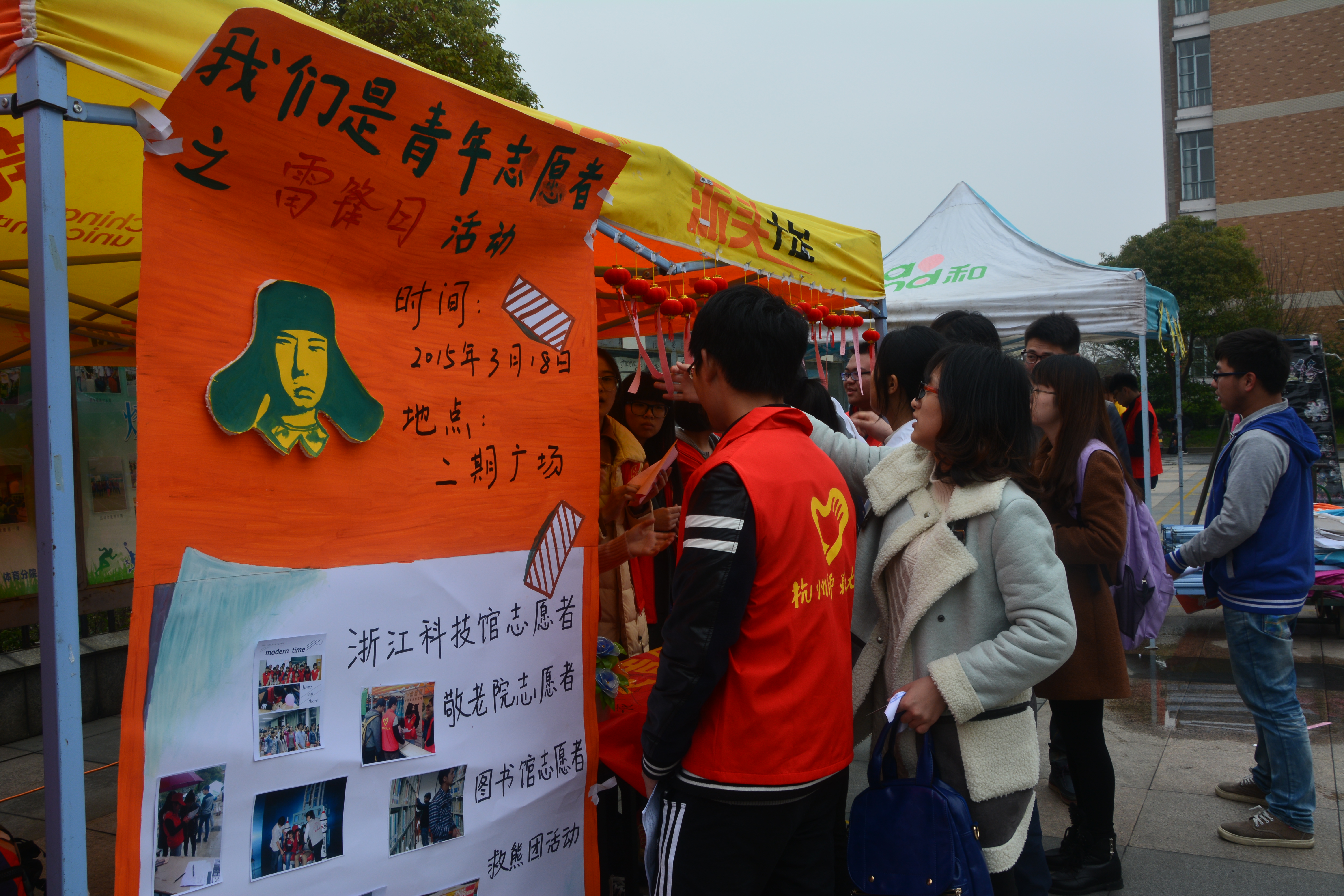 中午十一点半,工作人员们已早早布置完活动场地,鲜艳夺目的海报、小巧玲珑的灯笼、平整有序的签名幅都在这个不大的帐篷里展尽光彩。学生下课后,人流越来越多,停留驻足在活动帐篷周围的学生也越聚越多。纷纷好奇地询问这是什么活动,工作人员带着温暖的笑容耐心地解释。同学们听完都跃跃欲试,在挂有灯谜的小灯笼前开展了脑力竞争。阵阵欢声笑语飘散在这阴沉沉、湿漉漉的空气中,不少同学通过和同伴的合作都猜出了谜底,兴奋地在签名幅上签上自己的名字,同时也得到了精致的奖品丝袜花。还有些同学仍然绞尽脑汁地猜灯谜,一声叹息、一次欢呼都让同学们在快乐的氛围里面了解了学雷锋日的活动。有些同学甚至拉来了自己的小伙伴一起参加这次的学雷锋日活动,还打趣地说,在这上面签上了名字,我们就得在生活中多做好事啊。在这新学期的伊始,和暖的春风正在吹来,学习雷锋的正义之风也拂过同学们的脸庞。随着灯笼上悬挂的灯谜越来越少,本次活动也接近了尾声,太阳虽然仍没有探出头但在这帐篷的周围却萦绕着欢笑、温暖、明媚的空气。