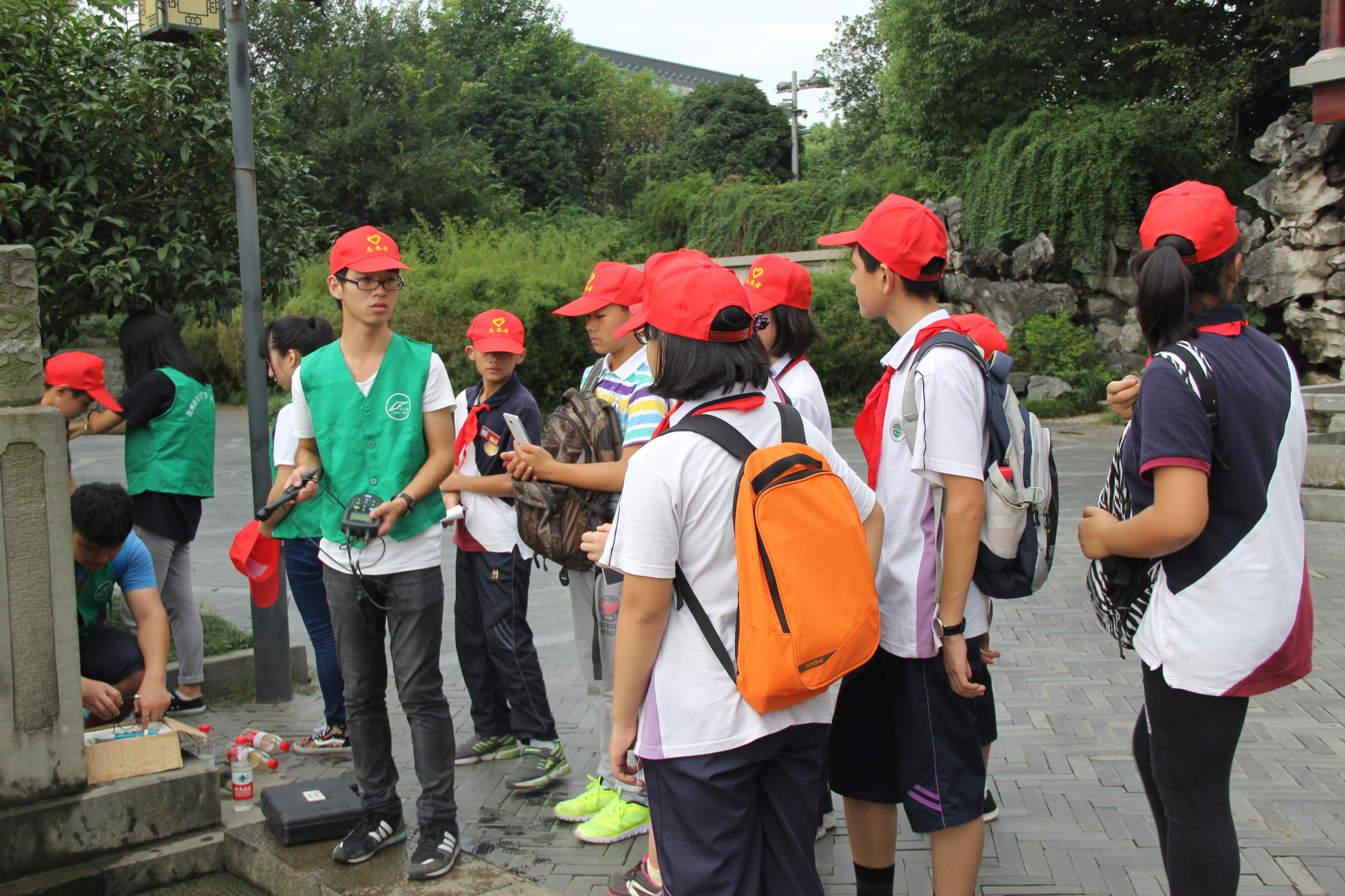 下午2时,经过沟通安排,宣传活动如火如荼地进行着。活动分为两个部分:第一部分,拱宸中学的学生随机分成五组,在"绿之翼"环保协会成员以及带队老师的带领下,拿着关于垃圾分类、“吾水共治”的调查问卷,以及环保宣传单,向行人做问卷调查、宣传环保知识;第二部分,"绿之翼"环保协会科研部成员向同学们展示使用仪器检测河水的过程。