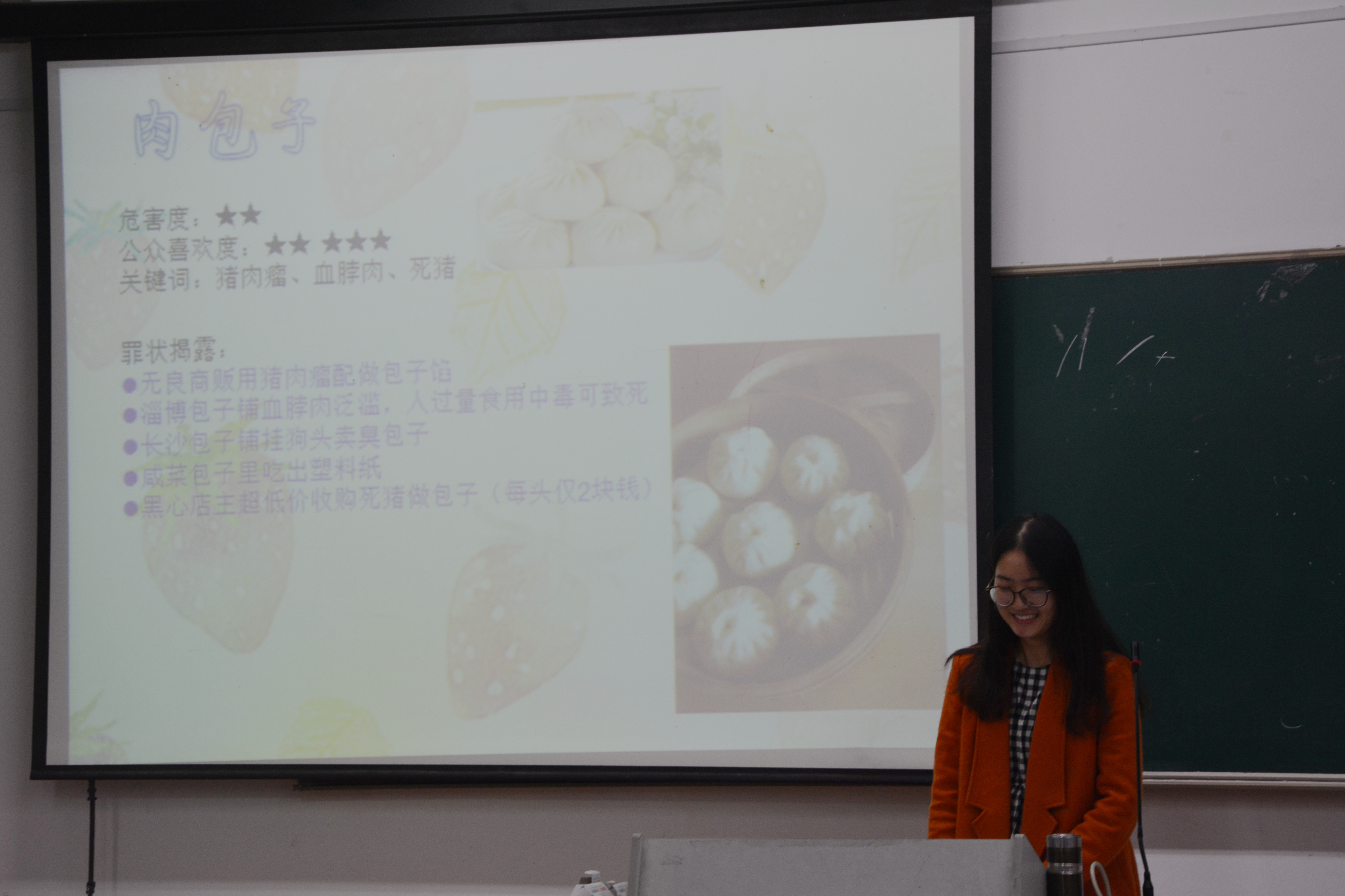 决赛分为选手自述和评委点评两个环节,评委综合选手的表现进行打分,每支队伍派一名代表以ppt的形式向评委和同学们展示自己小组的研究成果。首先上场的是来自食安151班的“272”小组。主讲人李柃漫以“食品安全何去何从”为主题进行演讲。她由一首打油诗引出主题,说明当今社会食品安全问题源于“无奸不商,无商不奸”。此外,她还列举了已经发生的食品安全问题,如三鹿奶粉中三聚氰胺过量事件,地沟油和皮革奶事件等。她们由此说明问题食品相当于慢性毒药,会对身体造成巨大的安全隐患。该小组又分别从企业、政府、消费者的角度说明了食品安全问题存在的原因,由此她们也提出了解决措施,提醒消费者们做到卫生饮食并提高警惕。接着上场的是生科141的“小公举”小组,她们以“我们身边的食品安全”为话题揭示了路边摊的黑幕。譬如烤肉串中的“挂羊头卖猫肉”,麻辣烫中使用福尔马林等。她们最后展示了饮食安全的十条黄金定律,强调要重视个人卫生和食品的清洗加工。最后参赛者是来自生科132的“舌尖之吻”小组,她们围绕食品添加剂介绍了添加剂分为着色剂、酶制剂、增味剂、防腐剂共四类。她们还介绍了食品添加剂的前景,相信新型无害添加剂的使用指日可待。最终,食品安全大赛的决赛圆满结束,生科132的“舌尖之吻”小组获得了第一名,食安151的“272”小组获得了第二名。生科132的“舌尖之吻”小组将代表生科院在本月29日中国计量学院参加校际决赛。
