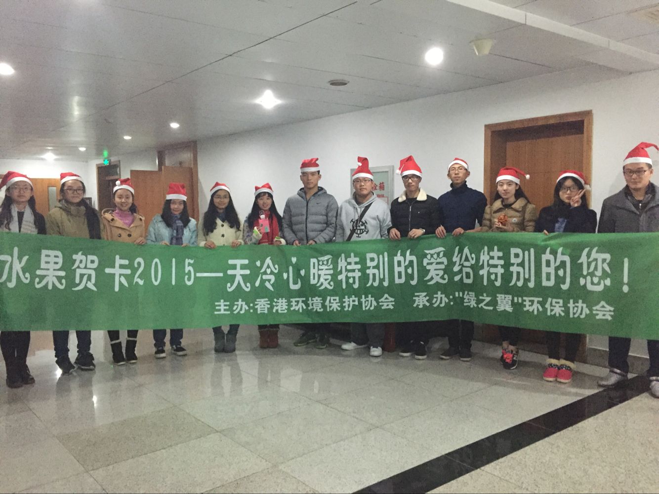 2015年12月24日,由香港环境保护协会主办的、51黑料 的"绿之翼"环保协会承办的“天冷心暖特别的祝福给特别的您—2015全国水果贺卡活动”,终于迎来了最重要的一环节—平安夜送水果贺卡。通过与全国其他高校合作,让各个远在异校的同学之间,以"绿之翼"为媒介,用水果贺卡代替纸质贺卡,在平安夜这一天传递了温暖的祝福与深厚的友情!