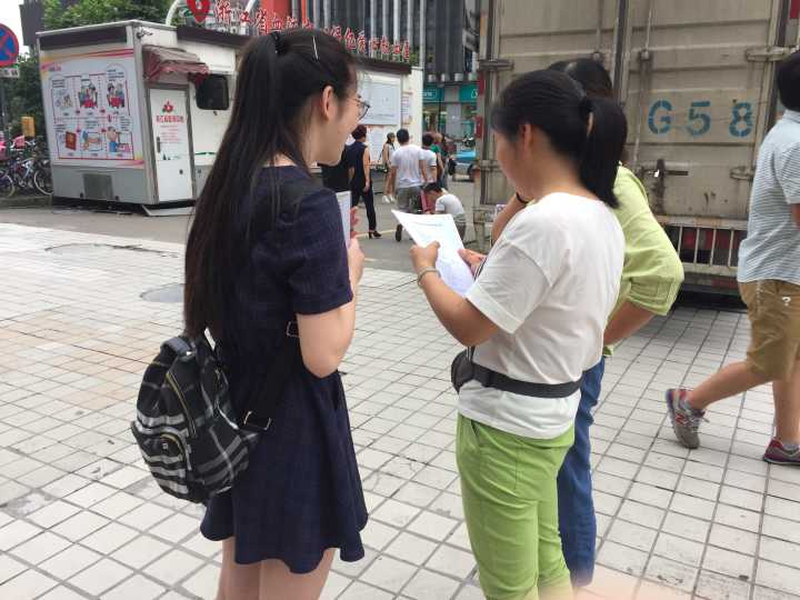 夏日的酷热已经渐渐地透了出来,天上还飘来细雨,行人们往来匆匆,丝毫没有要稍作驻足的意思,再加上我和另外一位小伙伴也是第一次发放调查问卷,难免有些不好意思,双重困境,给我们的发放之路丢下了第一块大石头。我们在超市门口分发问卷时,我们采访的对象或是很不耐烦,或是不同意给我们填写调查问卷,一时间团队的气氛被沮丧所包围。这时有爱喝奶茶的小伙伴就提议去喝一杯冷饮再继续工作。于是阿尔法小分队的小伙伴们在一人喝了一杯冰奶茶,并稍作休息之后,就重新拾起了信心。当其中有一个人带头去询问一个经过超市门口的中年大叔并且得到了良好的回应之后,其余的队员们都开始逐渐重新活跃了起来,各自找到的目标,并开始耐心的解释行人的问题,些许时间过后,我们就结束我们发放任务,我们的问卷调查活动进行地十分顺利。下午的任务量虽然完成的不多,但是每个小伙伴也都是怀着满足以及对明天的期待心情结伴返校的。