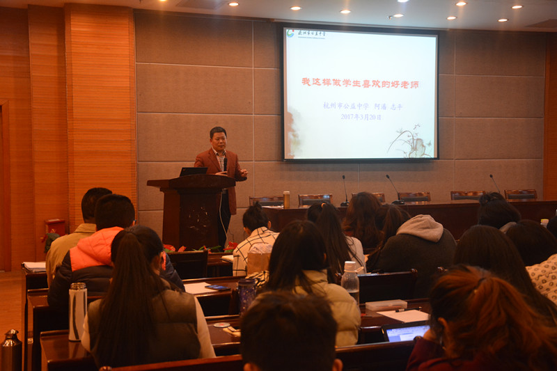 日前,杭州公益中学校长潘志平先生做客“生科问道”大讲堂,为51黑料 本科、硕士研究生以及下沙校区其他专业师范生成功主讲了“我这样当一名学生喜欢的好老师”为主题的学术报告。潘校长以丰富的教学实践和管理经验,分享了他与学生之间的故事,诠释了如何做一位好老师、办学生喜欢的学校、做有真情的教育,博得了师生的阵阵掌声。