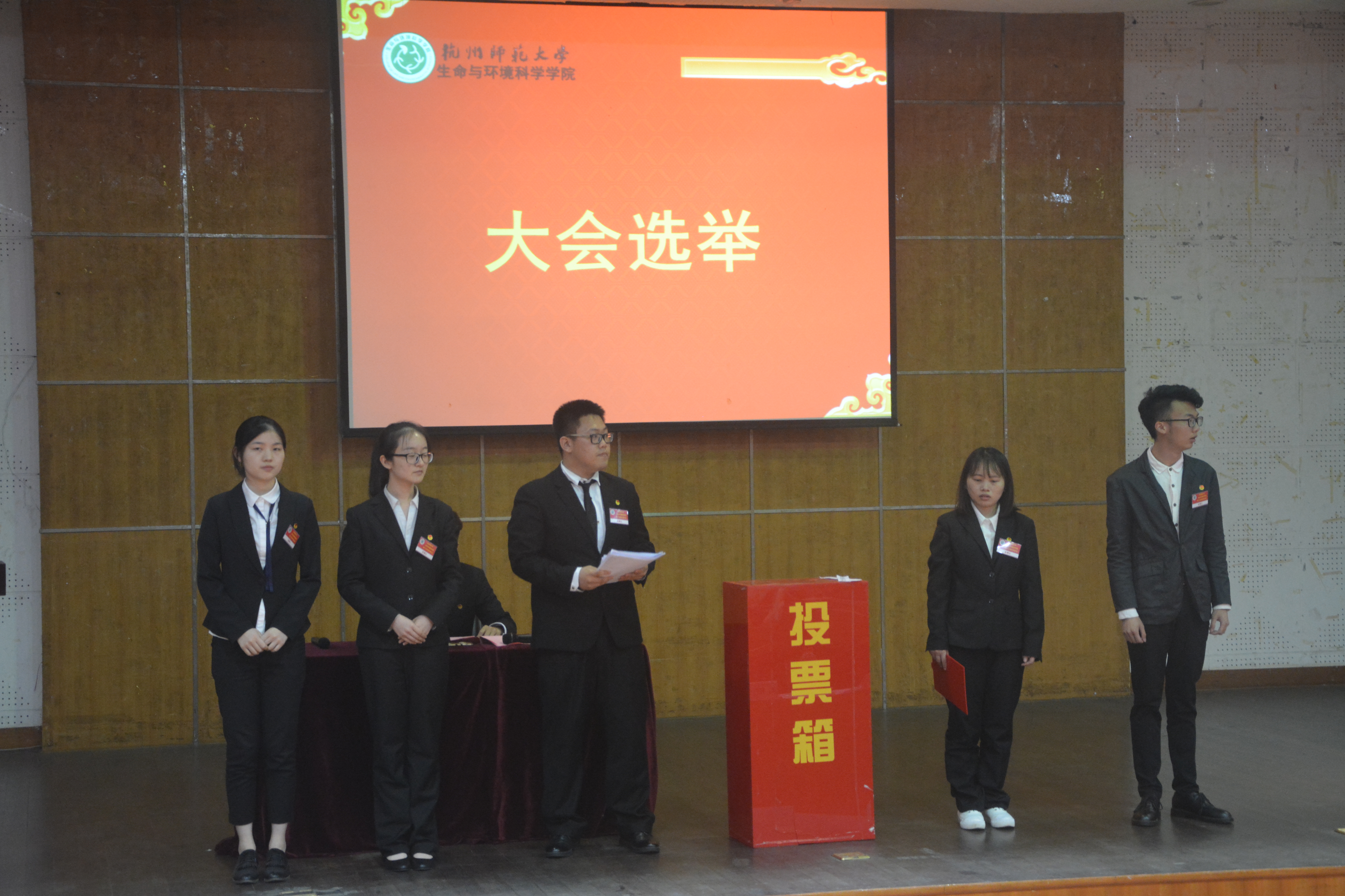 会议第二阶段——正式会议。首先,全体起立,奏唱国歌;接着,校学生会代表与兄弟学院代表依次致辞;然后,学生联合会主席李楠发表讲话,总结了生科院第十五届学生联合会的工作情况,并简要回顾了过去一年本院所举办的特色活动。最后,大会审议通过生科院第十六次学生代表大会选举办法(草案),并通过微信平台——“杭师大生科院”介绍了本次学生代表大会的22位候选人。