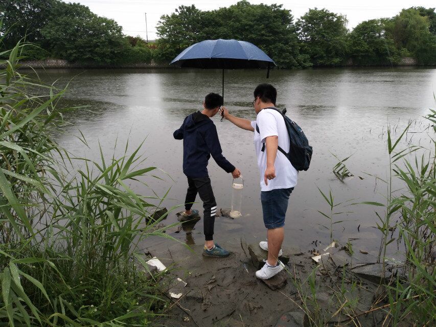 首先巡水小分队沿着河边巡视,对河道先有一个大概的了解,在辨认河边的植物动物时,志愿者们在河边发现了一株黄色的外来入侵花,就它的特点、入侵方式以及它对生态的负面影响展开讨论。不知不觉中,队伍已到达测水点,几位志愿者拿出了仪器,开始采水。校外的环保人士对采水检测的环节十分感兴趣,志愿者非常详细地介绍了仪器的使用方法,他们也亲自动手进行了测量。此次测量的是河道内侧以及外侧这两个取水点的水样,测量的结果也会上传到公众号,进行数据的统计。