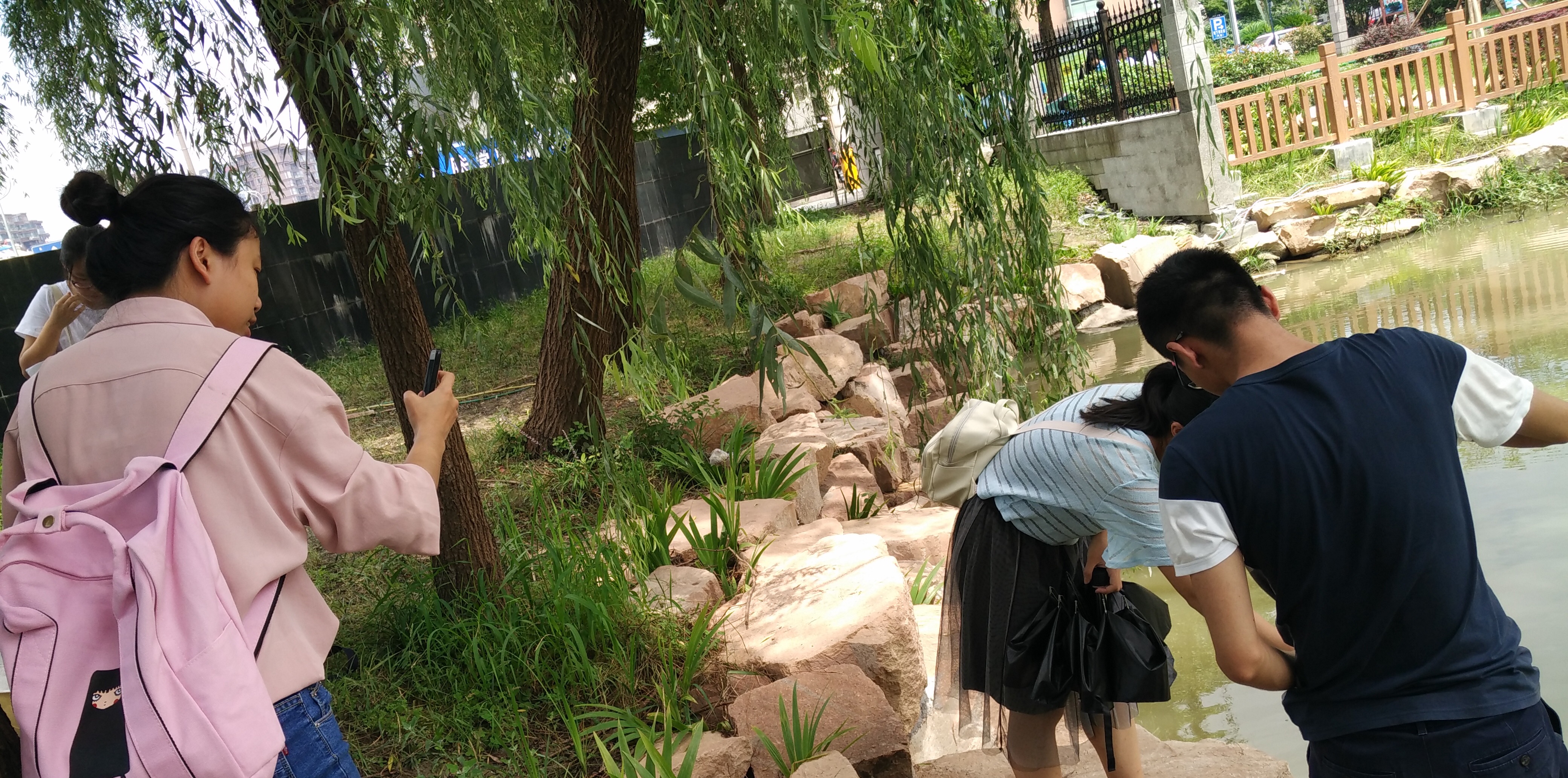 实践小组在区五水办负责人引导下,前往南湖区府南社区的各个采样点,实地考察五水共治街道的工作成果,由实践小分队小组成员进行现场水质检测。考察分三步:一看、二测、三分析。实践小组成员首先使用水样采集器从采样点断层中采集水样,从水样的色度和浊度进行初步的评判;紧接着,成员使用便携式多参数水质检测仪器进行盐度、电导率、氧化还原电位、溶解氧、pH等指标检测,并作记录;最后水样装入采集瓶,贴上标签,带回杭师大生科院水环境实验室,对其氮、磷等含量进行实验分析。