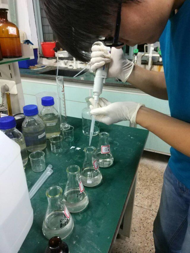 采完水样的第二个工作是水样测试实验。本次社会实践期间共进行了6次水样测试实验,分别测试了各水样的四个指标:溶解氧,PH值,高锰酸盐,以及吸光度。其中涉及到的仪器有:活氧电极检测仪和PH值检测仪等等,而涉及到的实验试剂和步骤也较为复杂,如过硫酸钾溶液、硫酸溶液、钼酸铵溶液等等。由于实验类型和步骤较多,队员之间进行了较为细致的分工,以确保每一项实验的顺利完成。除此之外,分别有队员负责实验过程的拍照和数据记录。高度的配合与高昂的实验态度保证了实验的顺利进行。