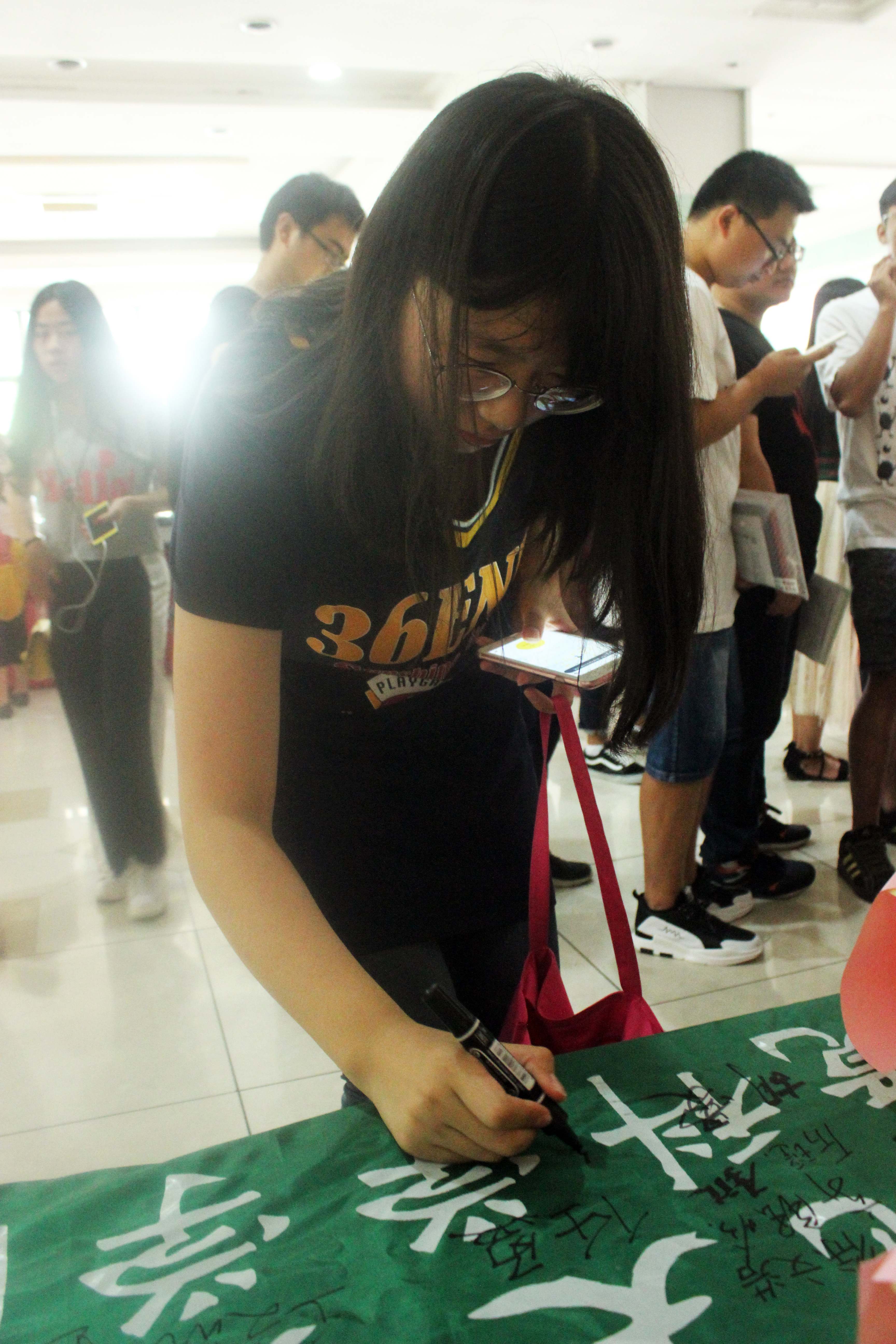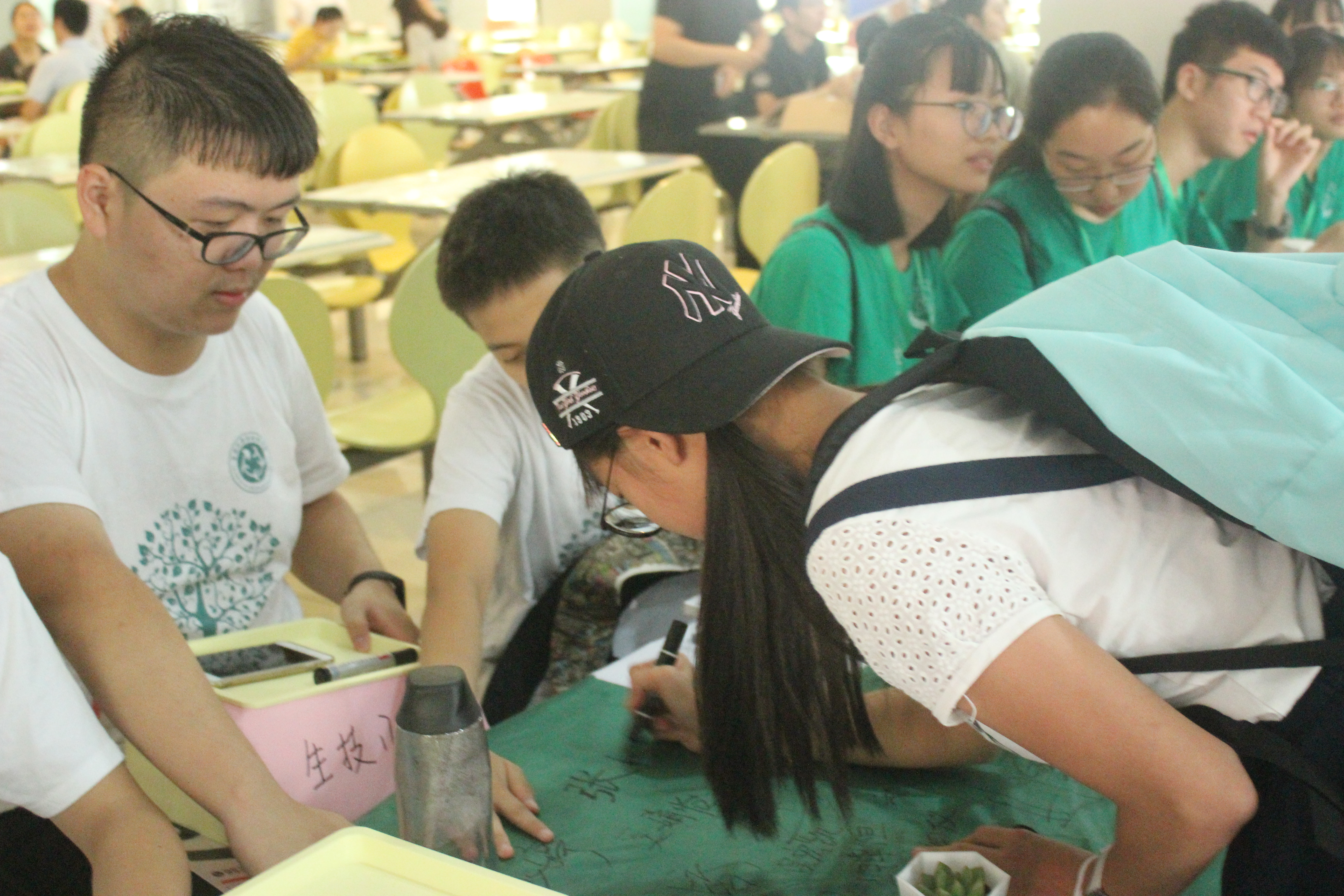 留念——除了“绿植领养”,在食堂生科院还设置了“签院旗”活动,院旗作为生科院的标志,将会是大家四年时光里重要的一部分,新生在跨入大学之际,将自己的名字签于院旗上,留下自己的姓名,留下自己的期许,也留下踏入生科院的第一笔。