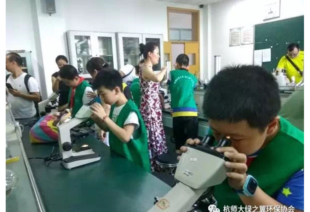 图4 小朋友们通过显微镜观察水中的微生物