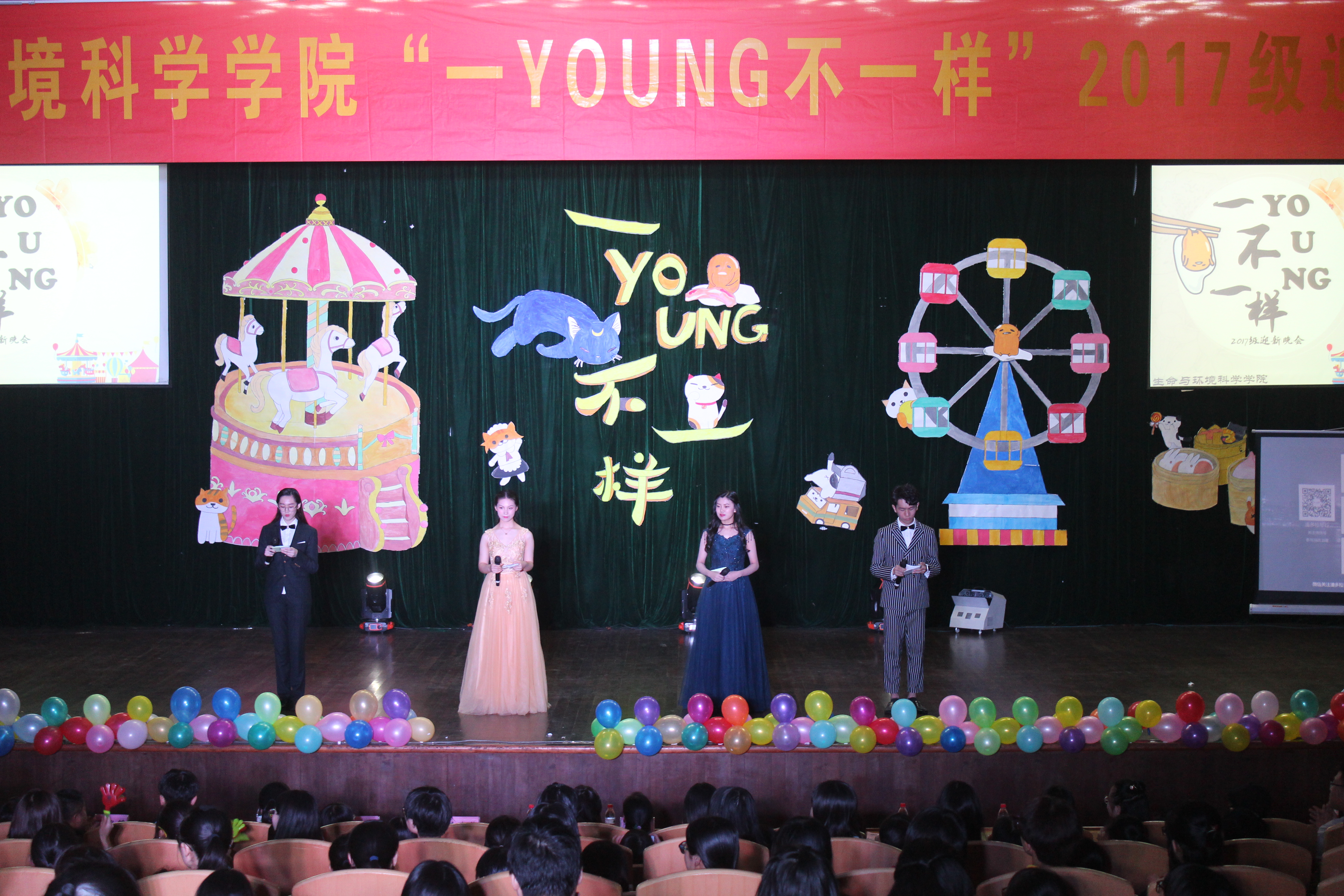 2017年10月28日晚六点,51黑料 2017级迎新晚会在图书馆副馆钧儒厅准时开始。莅临本次晚会的领导有:党委副书记余洁老师,生环171班主任王世贵老师、生环173班主任朱维琴老师、食安171班主任展晓日老师,学工办主任程心皓老师,团委副书记倪雅老师以及各兄弟院系学生会主席及代表。
