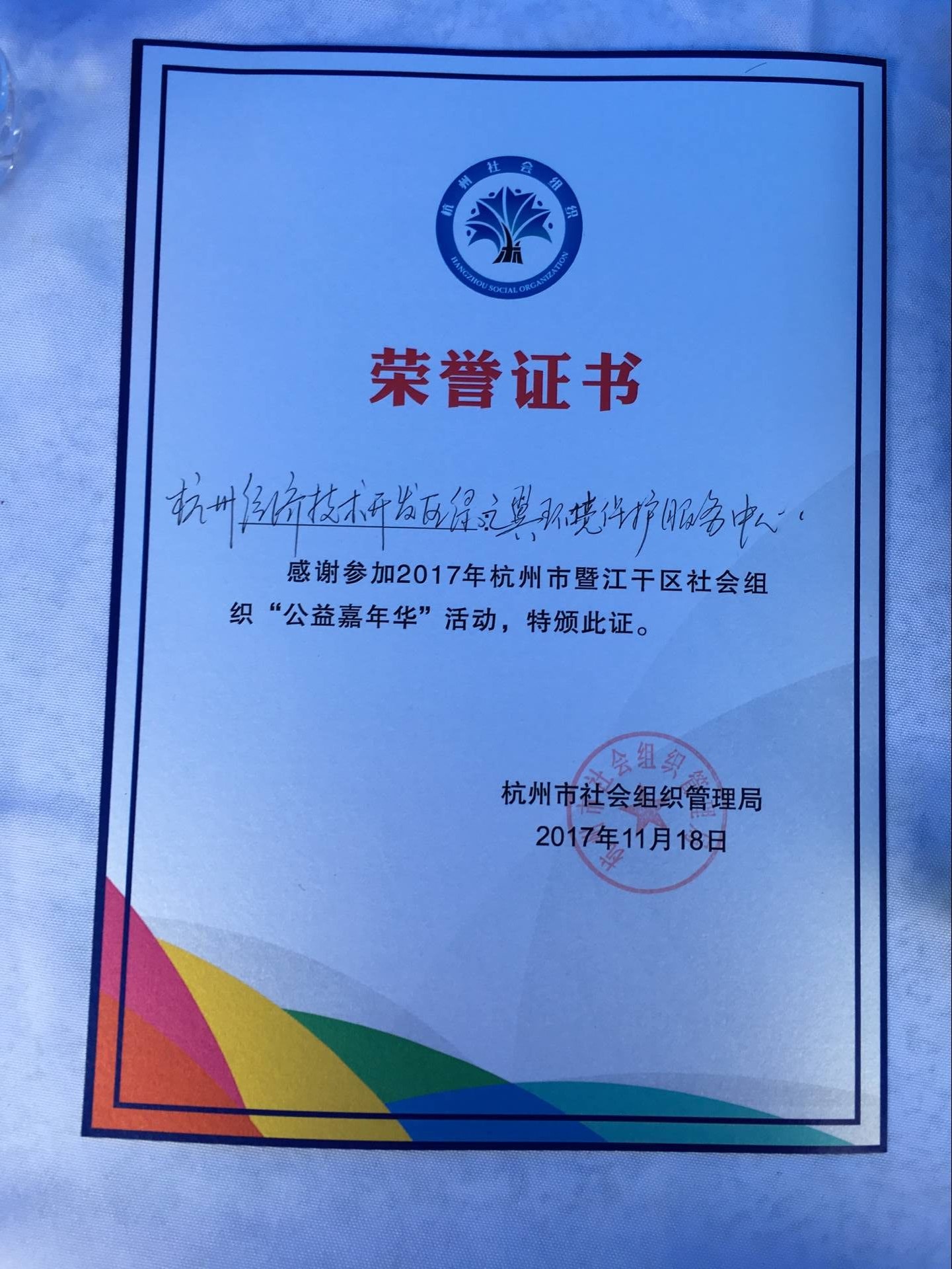 2017年11月18日,为向市民宣传环保理念,展示组织的特色亮点工作,"绿之翼"环保协会、杭州经济技术开发区绿之翼环境保护服务中心来到庆春银泰活动展位,参与杭州市民政局举办的2017年杭州市社会组织“公益嘉年华”活动,向市民们介绍和教授制作叶脉书签。