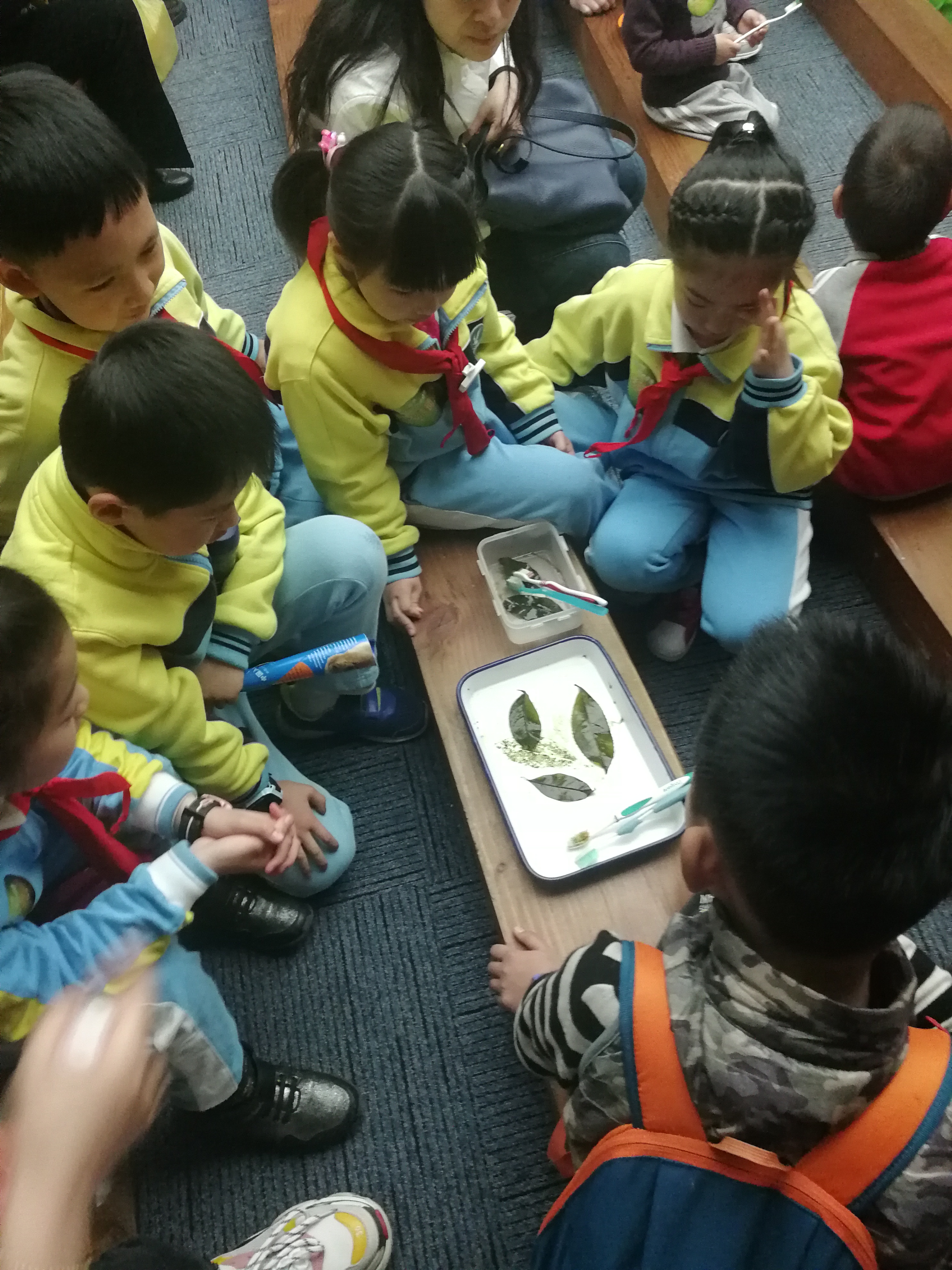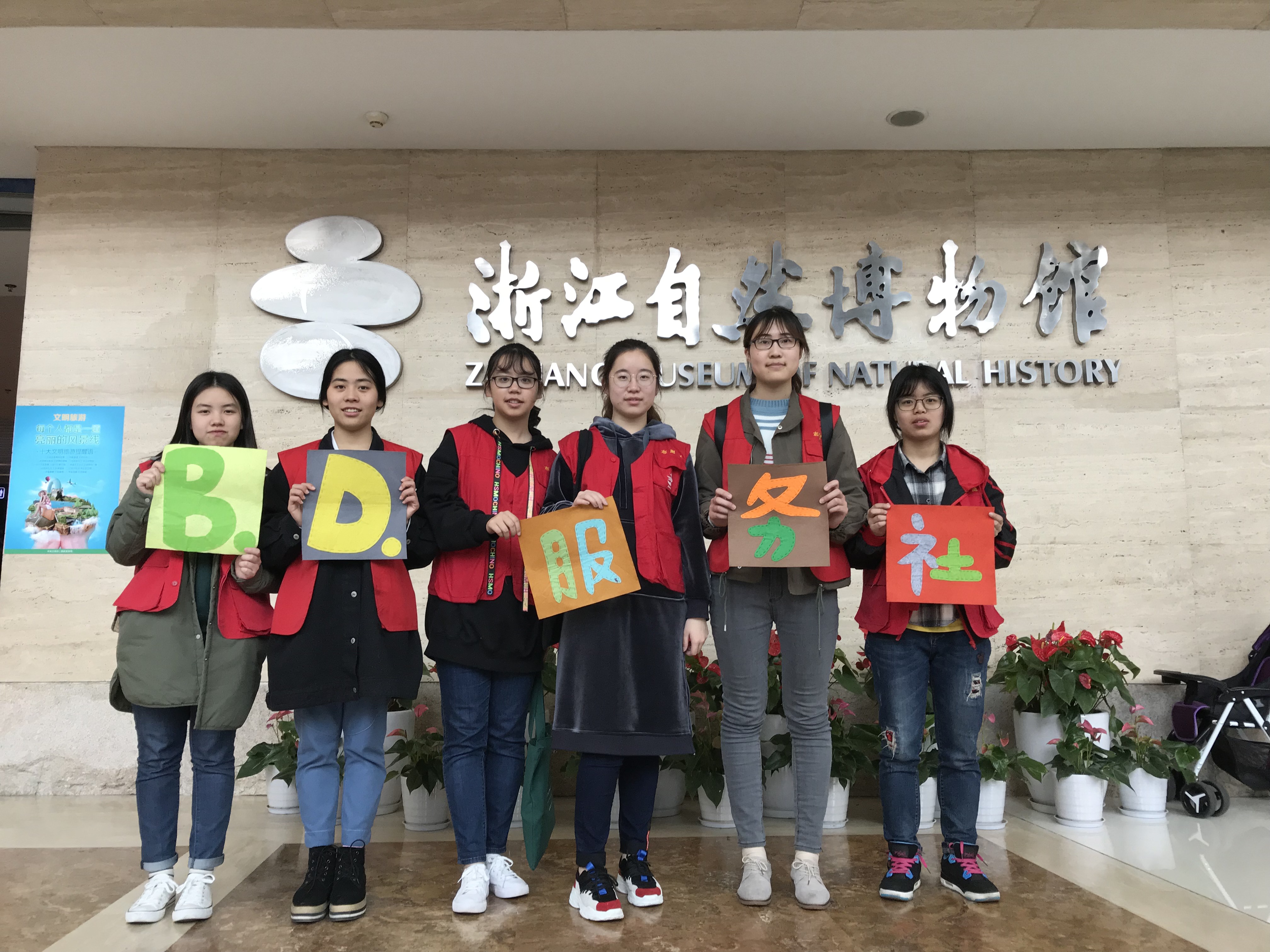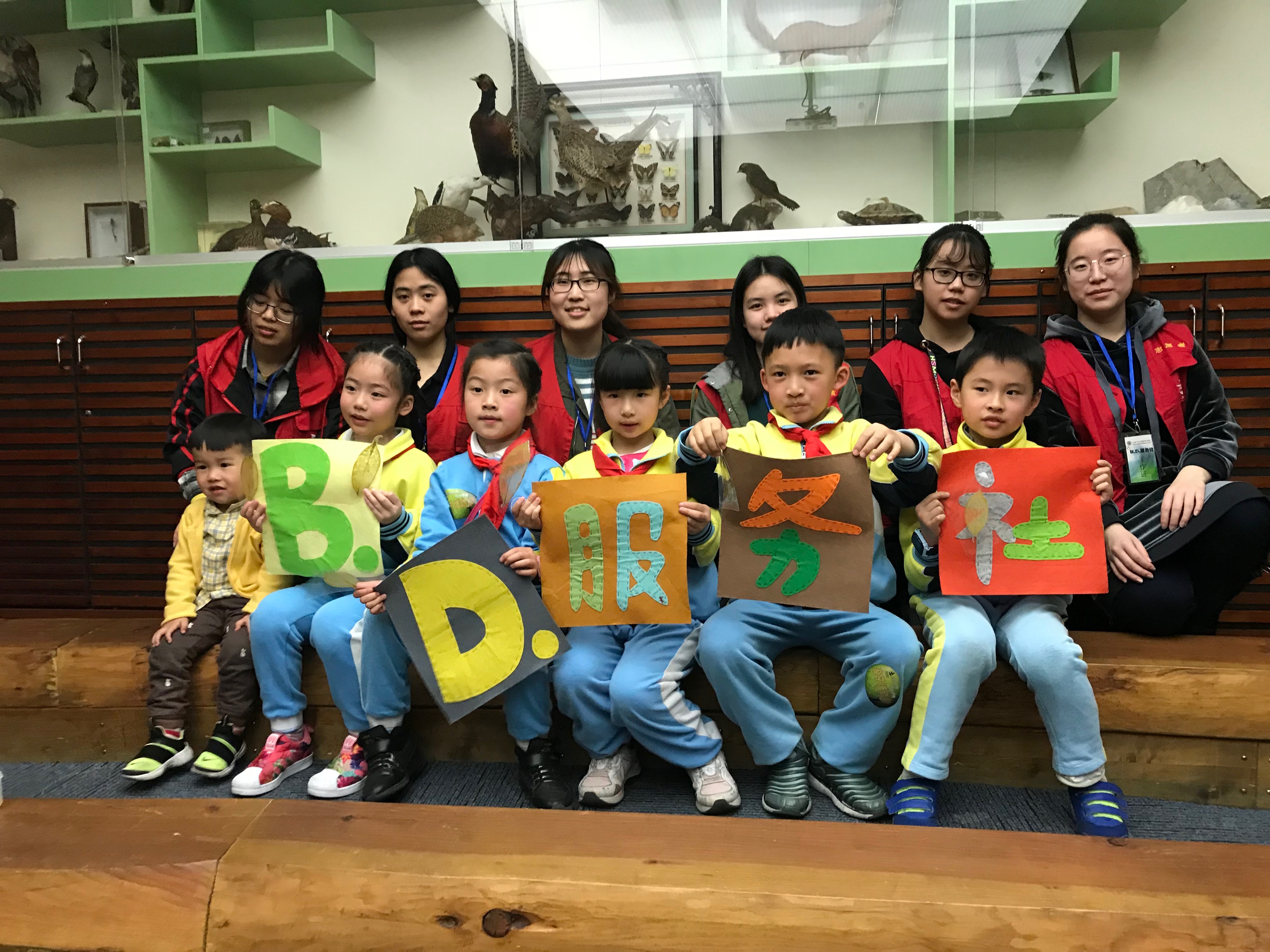在校门口报刊亭集合完毕后,B.D.服务社的社员们便到地铁站乘车前往浙江自然博物馆。志愿者们到达博物馆后,负责广播词的同学先到服务台广播活动,主讲人则到四楼小科普教室准备视频和PPT的播放,其余B.D.服务社的社员每人手持一张宣传单到博物馆大厅宣传活动。很快就有感兴趣的小朋友和家长到服务台报名,并在志愿者的引导下来到四楼科普教室准备参加活动。一开始小朋友们都在研究桌上摆放的五颜六色的盘子并讨论它们的用途,但很快就被主讲人生动的讲解和精美的视频吸引了,视频由一段动画片引入,向小朋友们介绍了植物分类的科普知识并普及了多个树叶的种类。在互动问答环节中,小朋友都积极参与,主讲人也解决了大家提出的疑问。