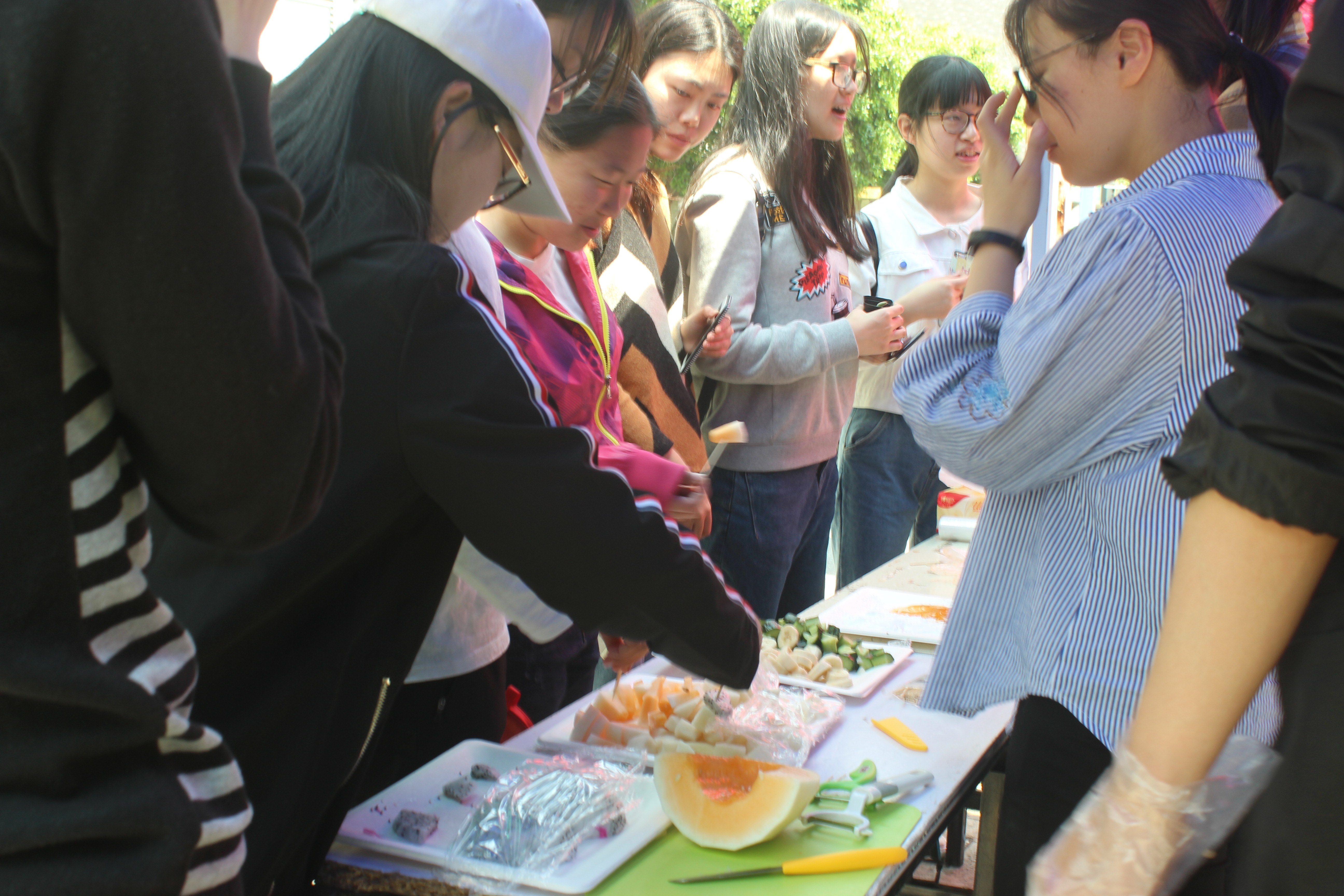 虽然要答对四道题才能进行糖浆水果的制作,但夏日炎炎,冰凉可口的水果对同学们有着极大的吸引力。题目虽有些难度,比如“校庆日是几号”“说出5个学校的著名校友”“植物细胞与动物细胞有什么区别”“生物主要分类”“今年校庆是学校建立的第几周年”诸如此类,但是同学们互帮互助,大部分同学都答对了题目,心满意足的制作属于自己的糖浆水果。