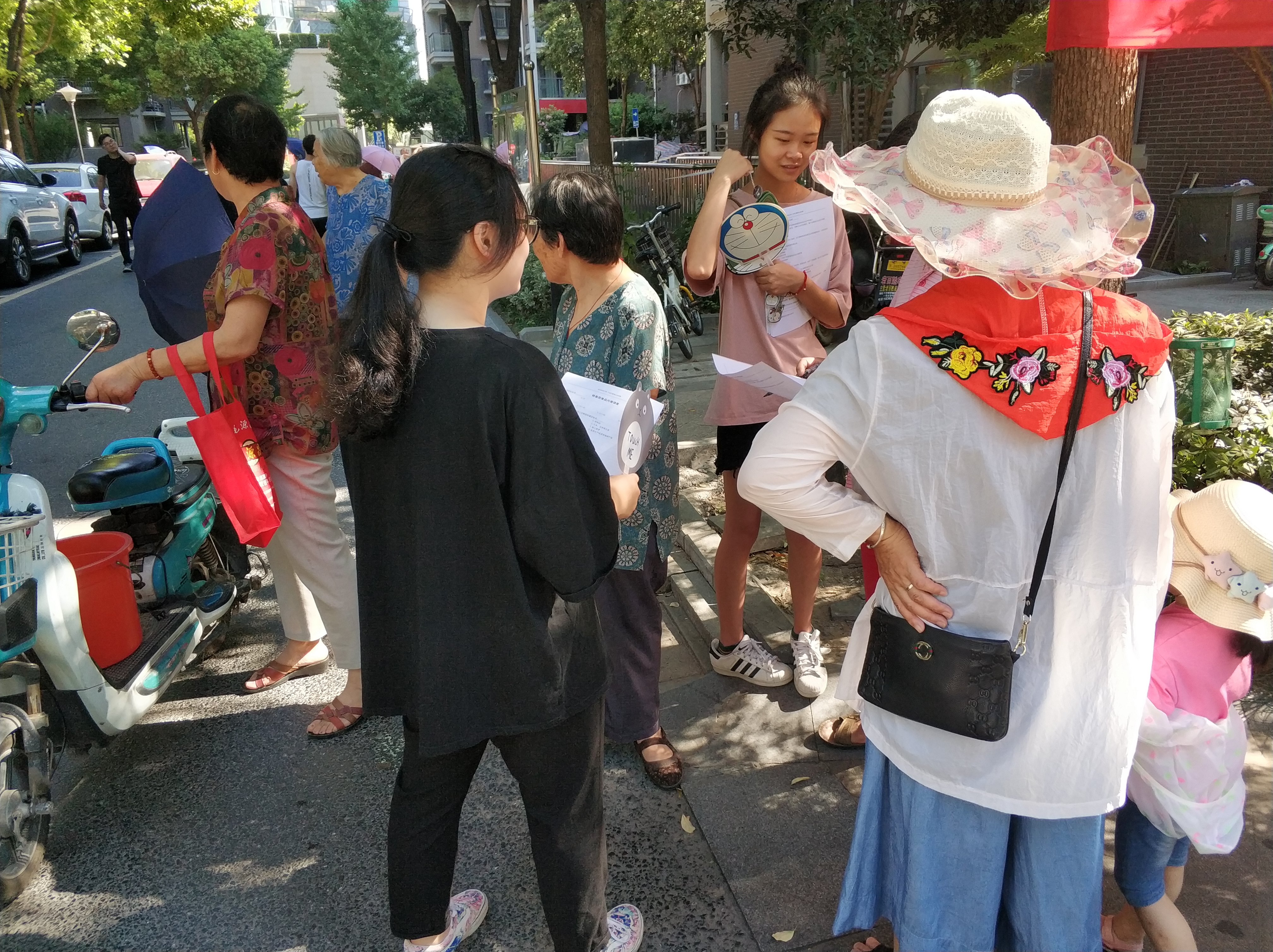 在海报和横幅准备完毕之后,小组成员便开始进行社会调查问卷的发放。小组成员在此次宣讲会进行之前,事先准备了小扇子和糖果,送给填写问卷的居民,以感谢小区居民对本次活动的支持。本次问卷的发放在刚开始时进行得并不是很顺利。小区居民对填写问卷的热情并不高,大多数人对于填写问卷的请求都表示拒绝,这让一开始满腔热忱的小组成员们受到了一些打击。但这并没有成为小组成员放弃的理由。即便艳阳高照,小组成员依旧坚持在小区附近的马路和商铺内发放问卷和宣传册,为群众普及转基因的科普知识。临近正午时分,小组成员决定在小区门口集合,进行收尾工作。最后,小组成员进行合影,此次的转基因宣讲会就正式结束了。