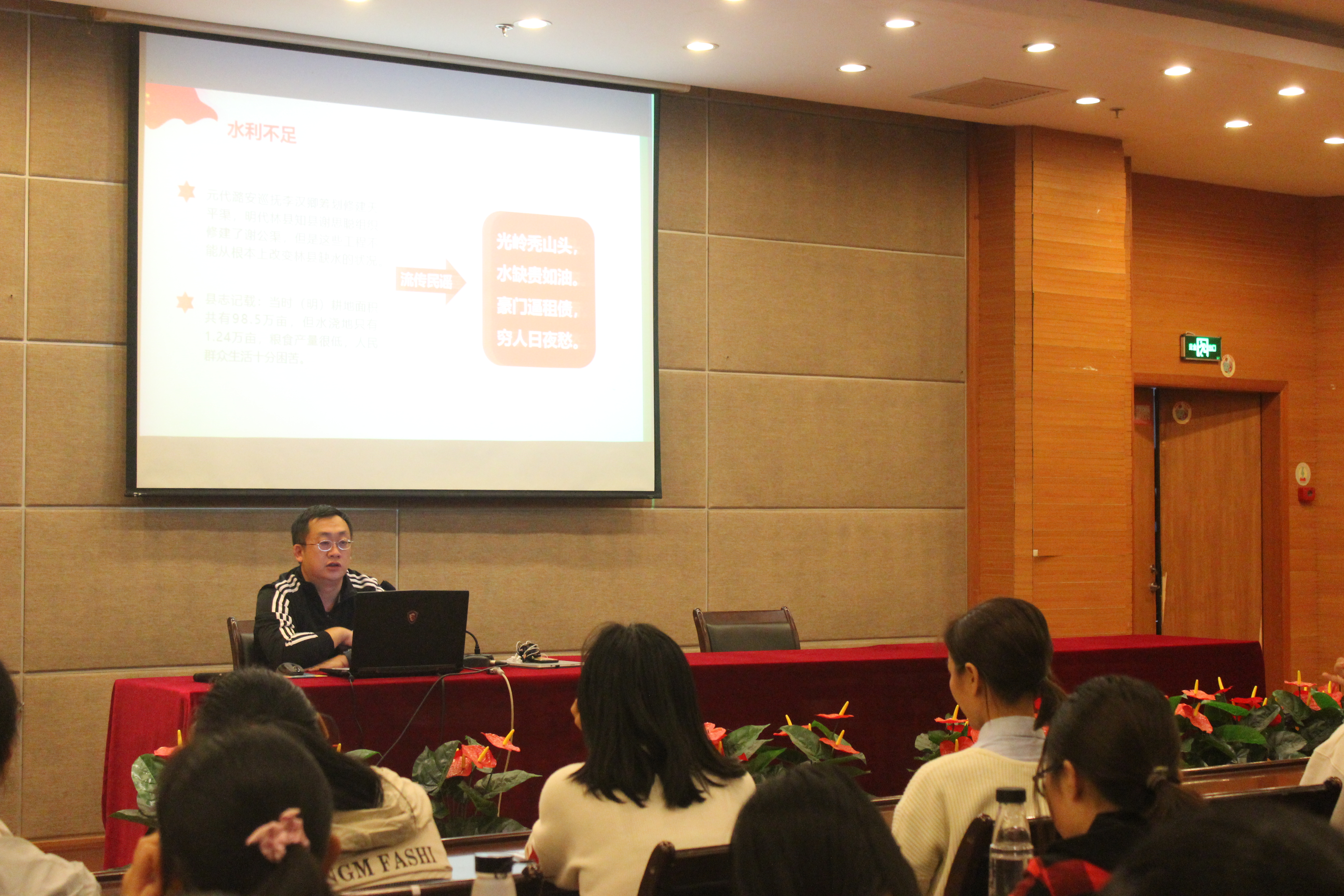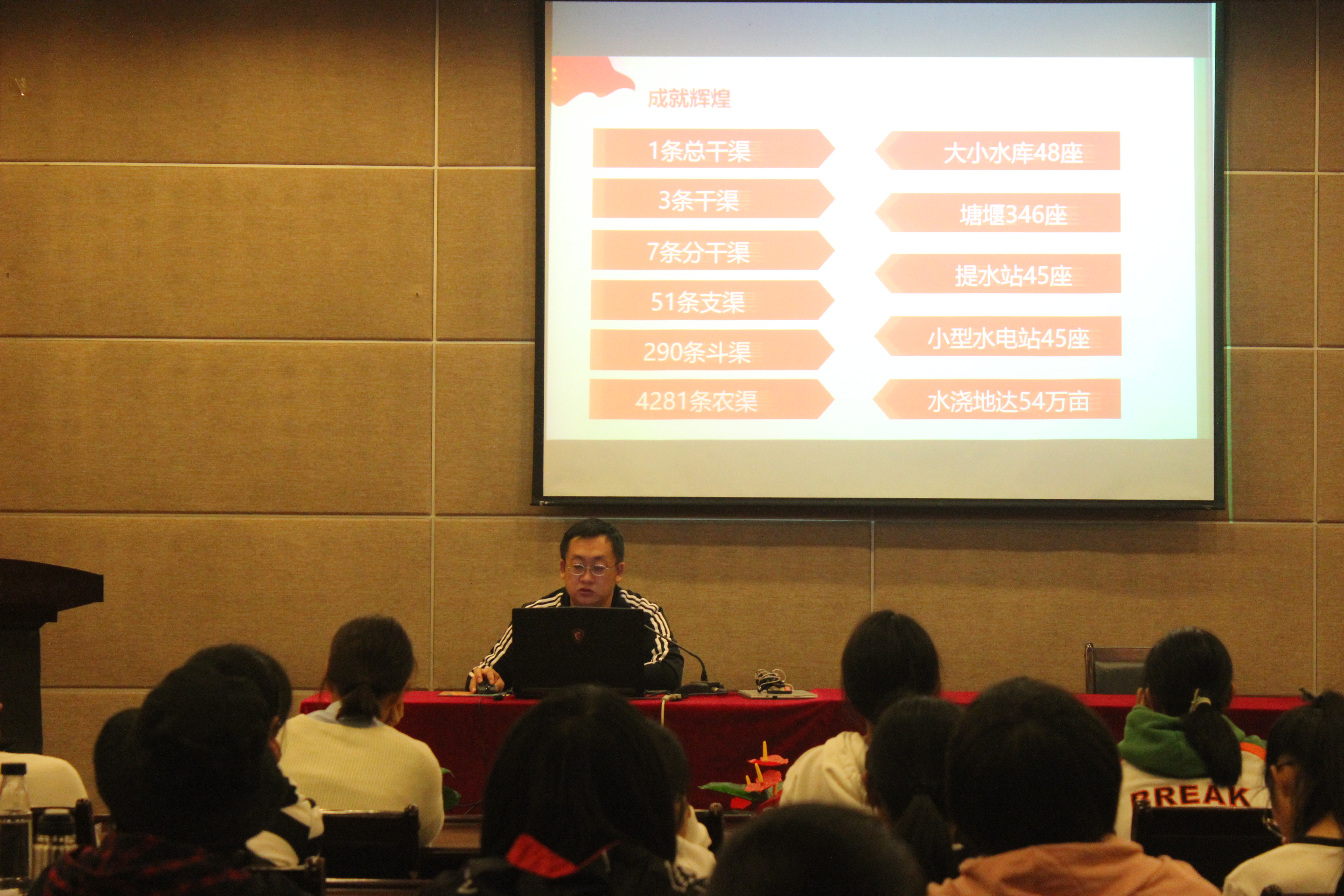 本次党课的主题是——柔韧不阙自悦鸣·红旗渠精神,张书记从三个方面,层层递进为同学们作了讲解。张书记结合自己外出参观学习的经验,向同学们讲述了红旗渠的由来:三十万林州人民,苦战10个春秋,仅仅靠着一锤,一铲,两只手,在太行山悬崖峭壁上修成了这全长1500公里的红旗渠。之后,张书记又向同学们介绍了红旗渠精神——“解放思想、实事求是、自力更生、艰苦创业、自强不息、开拓创新、团结实干、无私奉献”,并一一解释了红旗渠精神的来源。在讲到为此牺牲的吴祖太、张买江等烈士的光荣事迹时,同学们无不动容。