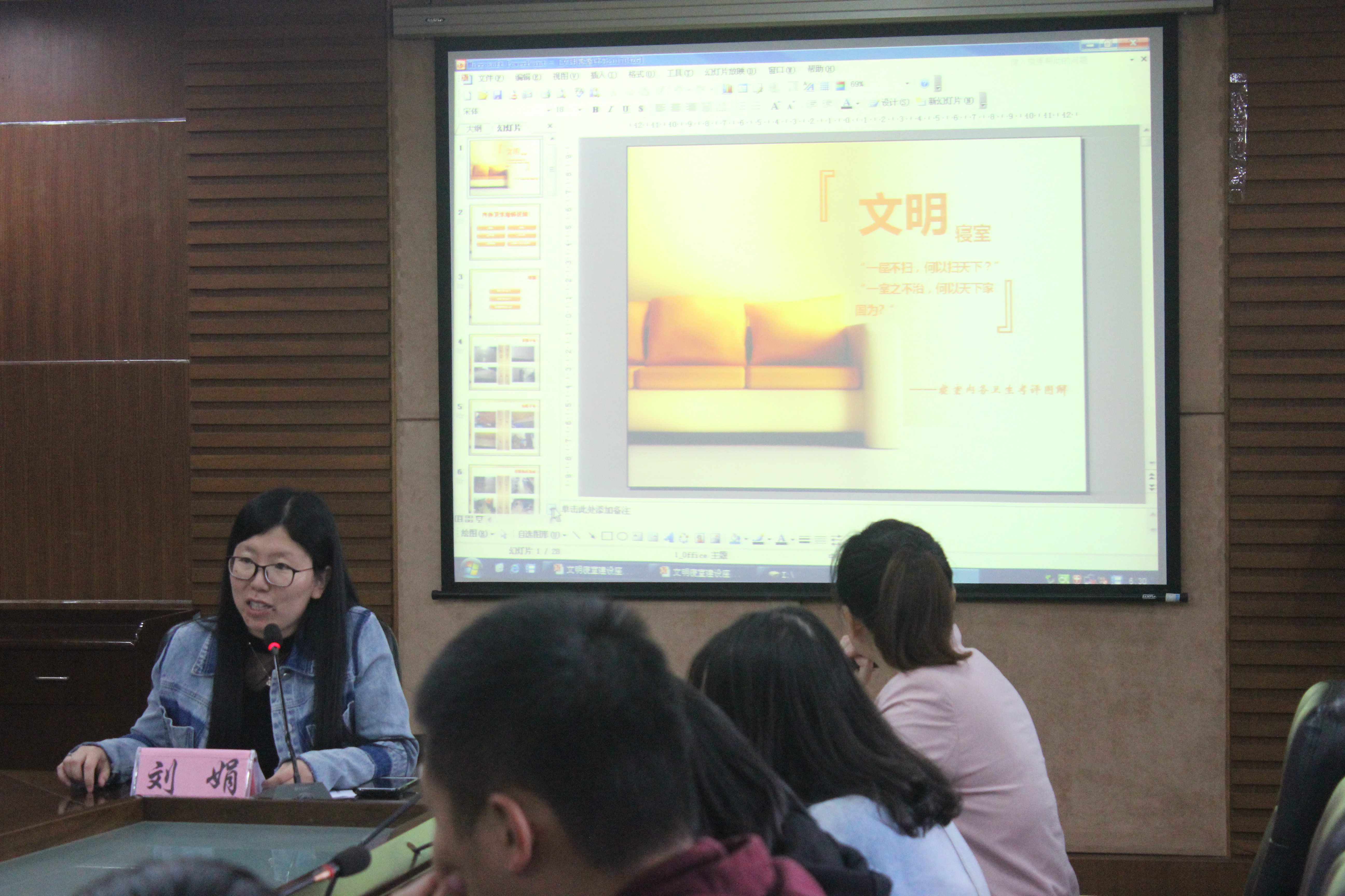 为了迎接即将到来的教学评估,进一步增强大学生的寝室文明和安全意识,努力营造学校良好健康的环境,11月7日,51黑料 于行政楼422室开展了“怎样建设文明寝室”为主题的座谈会。院学工办主任倪雅老师主持会议,公寓生活辅导员刘娟老师主讲。