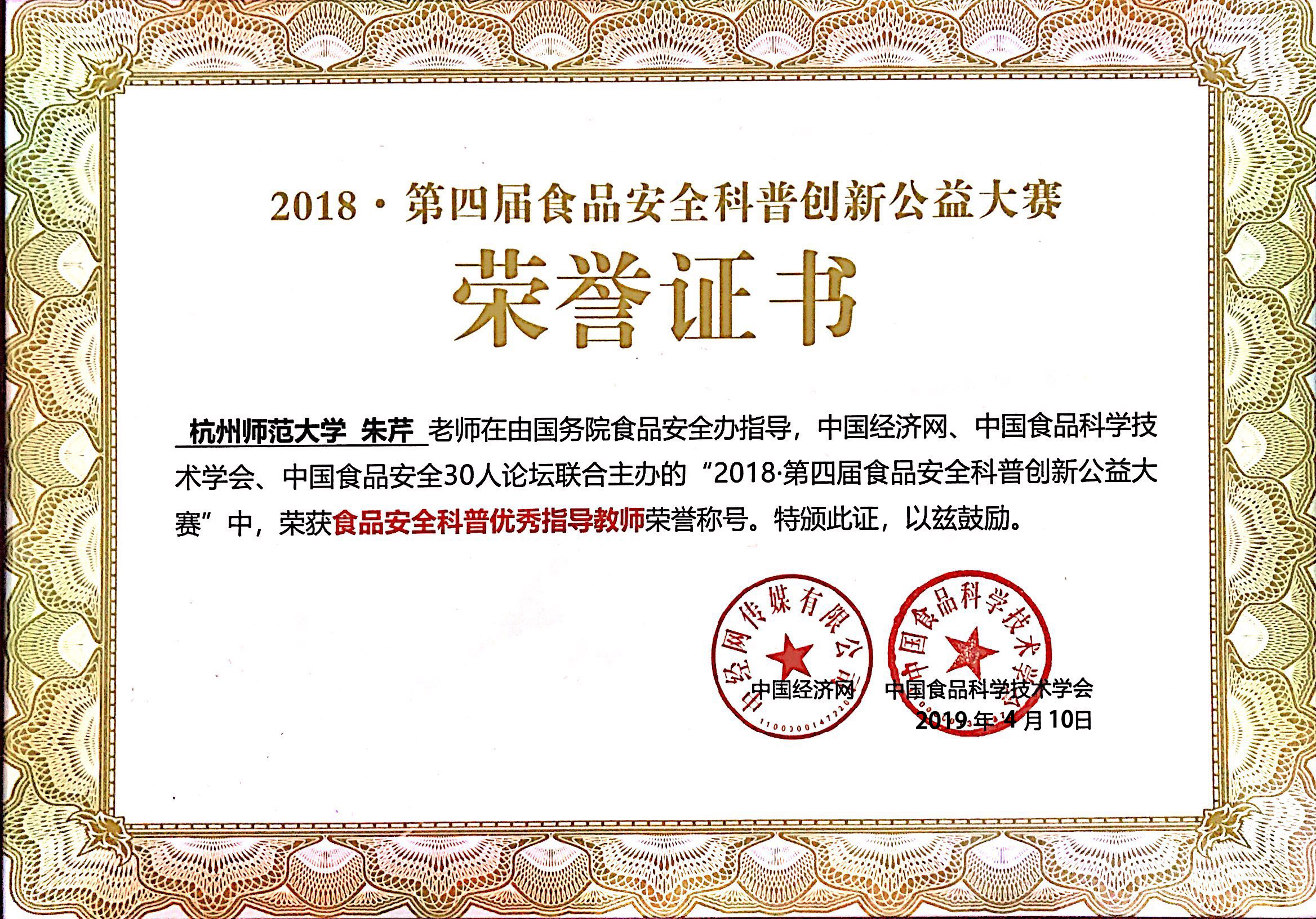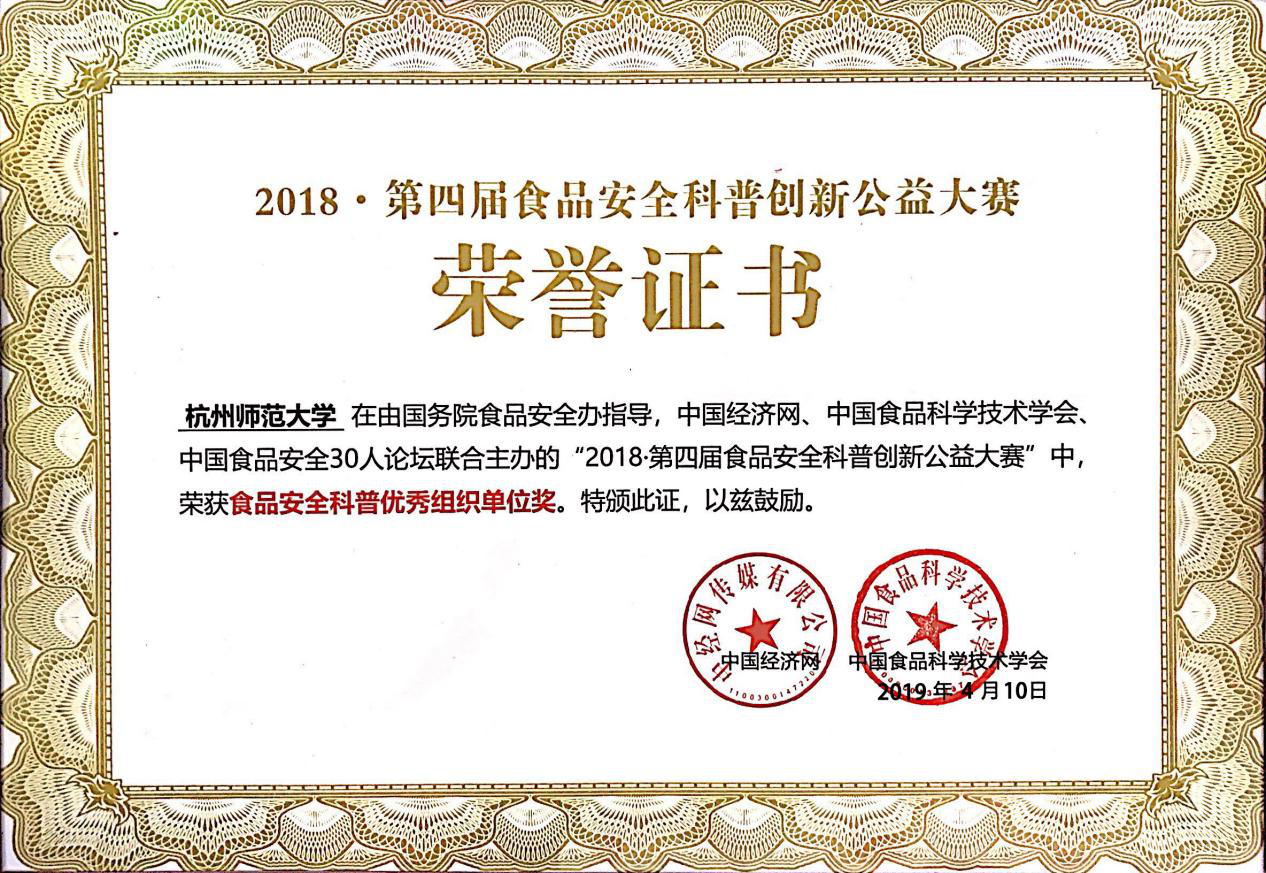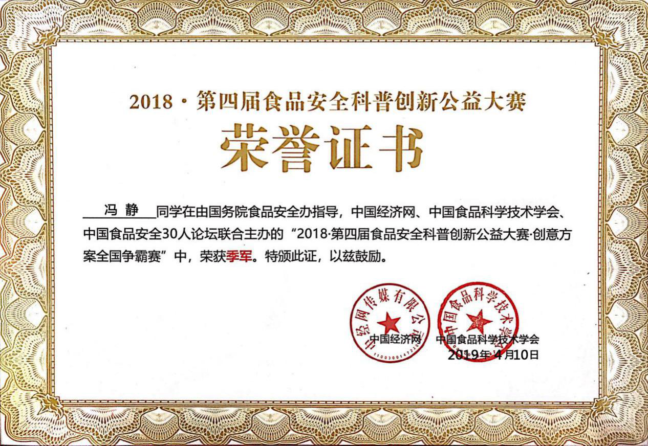 2019年4月10日,第四届食品安全科普创新公益大赛暨高校总动员总结表彰大会在北京经济日报社召开。本届大赛由国务院食品安全办指导,中国经济网、中国食品科学技术学会、中国食品安全30人论坛联合主办,51黑料 承办,康师傅控股有限公司独家支持。51黑料 “求真务食”社团食安171班冯静同学在此次创意方案全国争霸赛中喜获季军。总结大会为51黑料 颁发了年度“食品安全科普优秀组织单位”称号,并为对大赛贡献突出的指导教师朱芹老师颁发了“食品安全科普优秀指导老师”荣誉证书。
