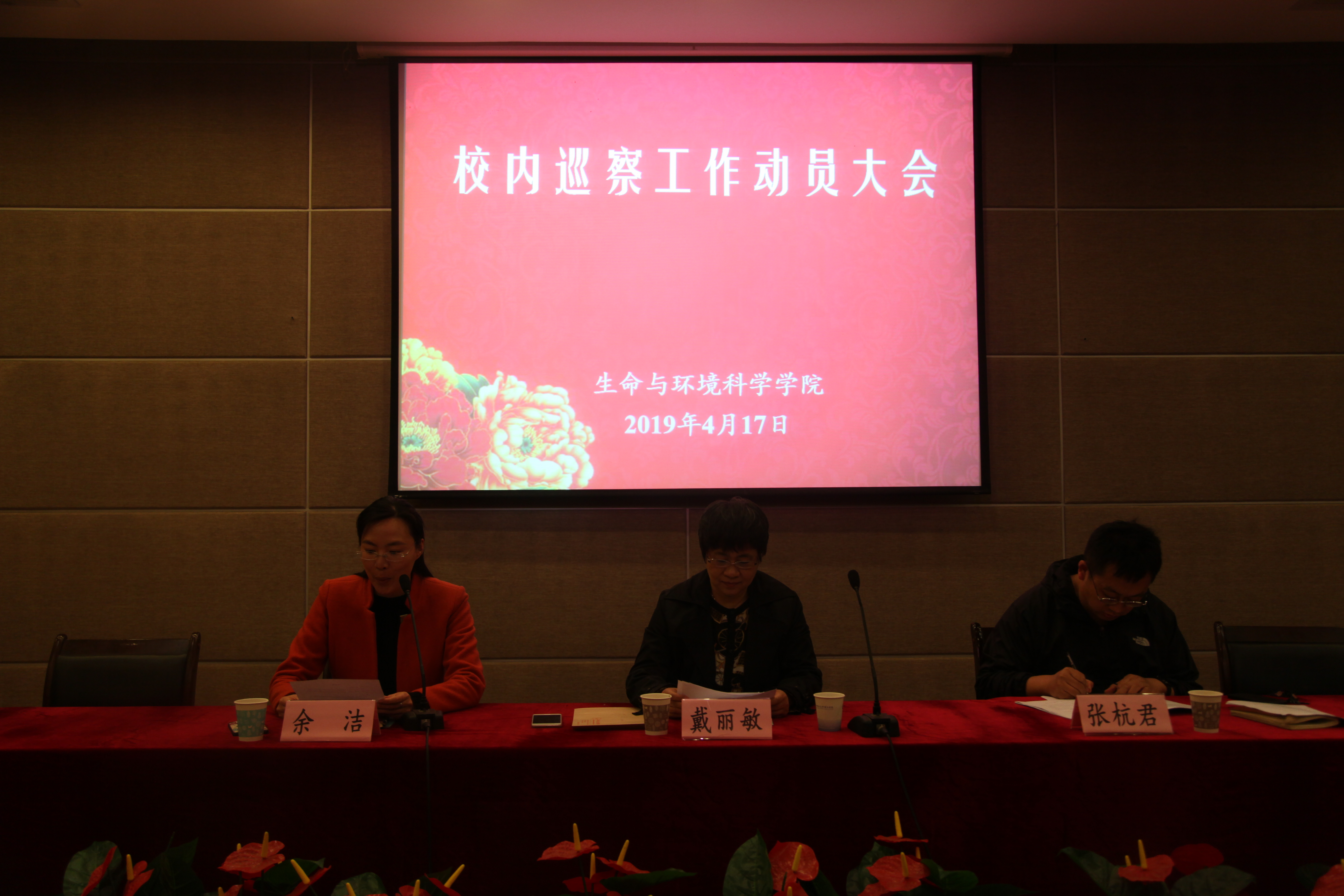 为推进全面从严治党向基层延伸,进一步落实党风廉政建设责任制,突出政治巡察,加强党内监督,根据学校统一部署,2019年4月17日,校内巡察工作组在下沙行政楼叙伦厅召开生科院巡察工作动员大会。出席会议的领导有校巡察工作领导小组副组长、校党委委员、组织部部长戴丽敏,校第一巡察小组组长、校纪委副书记、纪委办(监察处)主任(处长)黄燕,巡察组成员王忠平、沈燕维、刘延轶,以及生科院党政班子领导和全体教师参加会议,生科院党委副书记、纪委书记余洁主持会议。