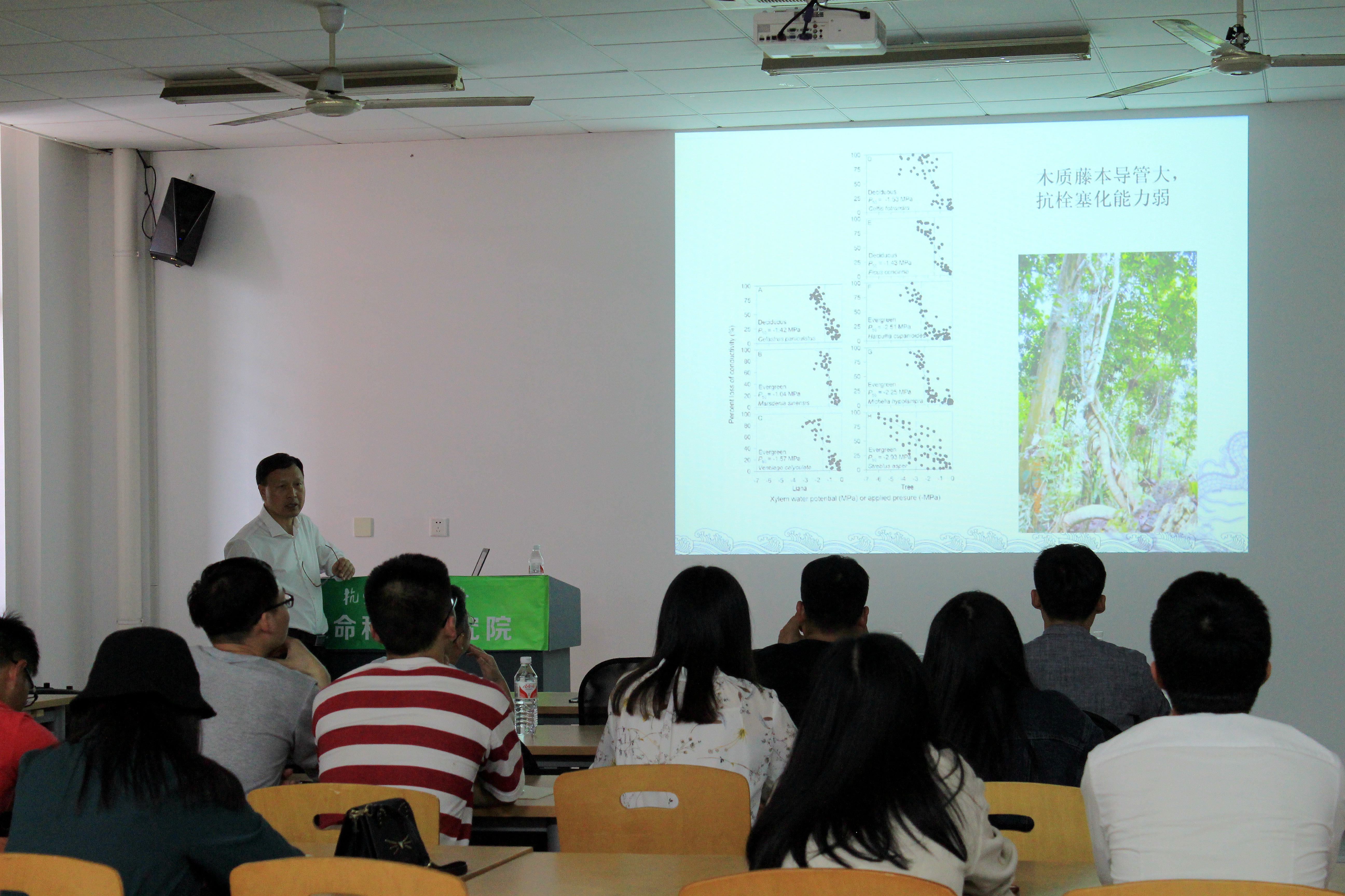 曹教授在报告中介绍根压是控制竹类植物最大高度生长的新机制,并且是它们的输导组织气栓修复的主要机制。植物水力学特征是植物功能性状的核心特征,且与生理功能密切关联。该报告拓展了本院师生的视野,进一步提升了学生对生命科学领域学习的积极性。