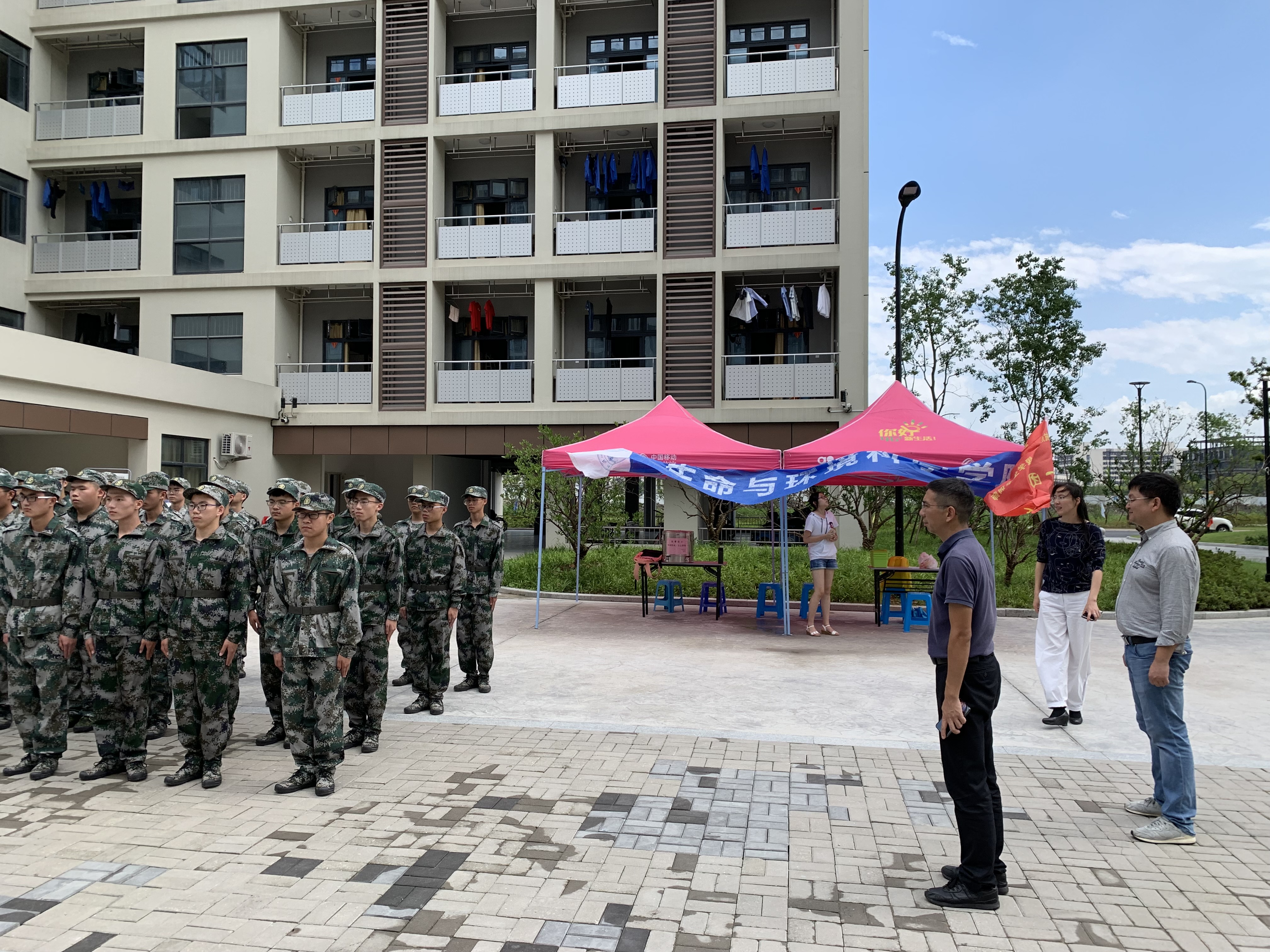 烈日炎炎,院领导们前往军训一线,看到同学们在酷暑中保持军姿,腰杆笔直。希望同学们可以再接再厉,发扬吃苦耐劳精神。看望期间,院领导对受伤、中暑同学表示关心,并希望营地工作人员可以做好后勤工作,准备好降温解暑的药品,备好饮用水,确保学生安全健康。