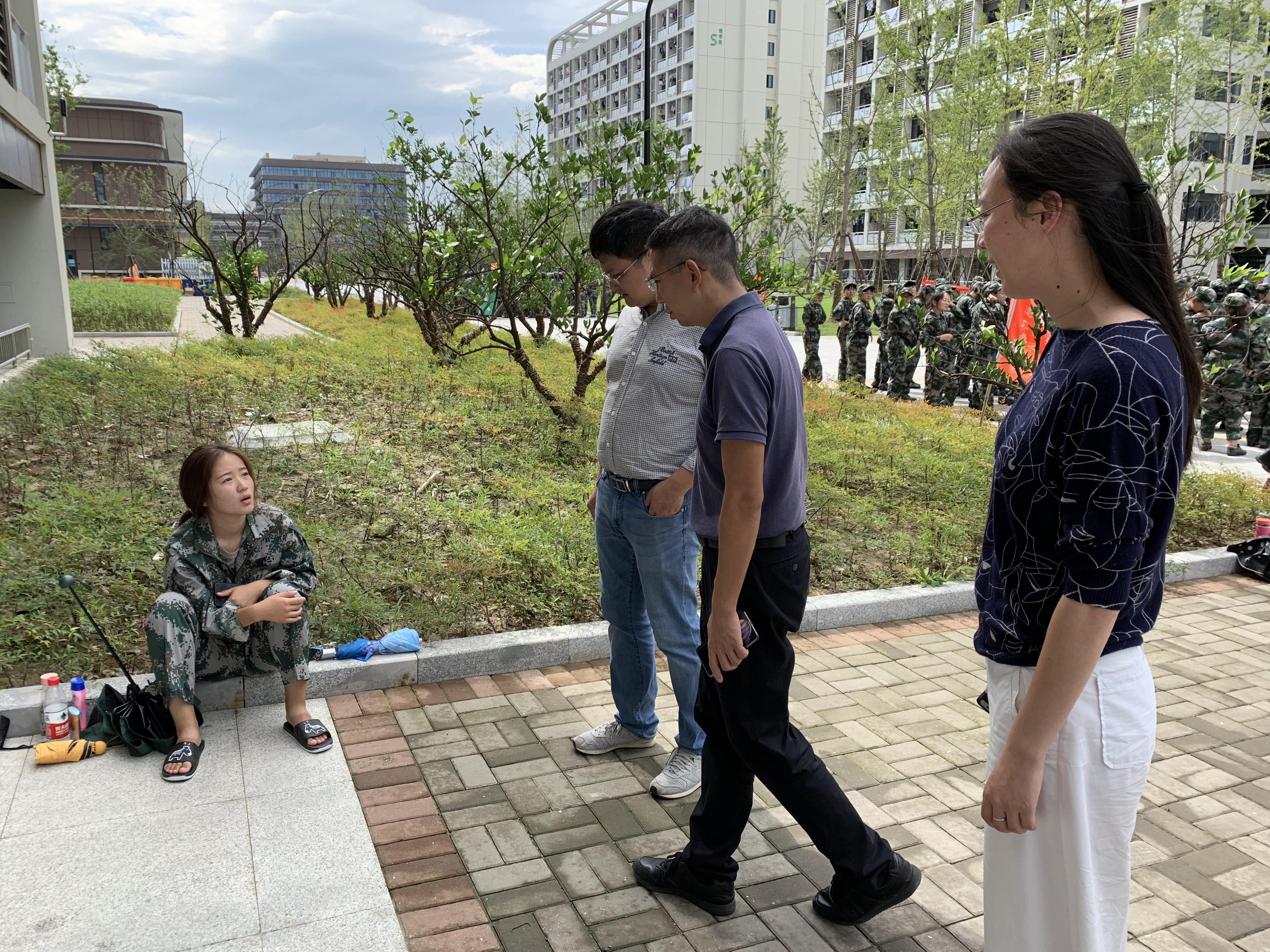 2019年9月6日下午,51黑料 党委书记张立明,副院长金仁村、党委副书记余洁、2019级辅导员陈好四人同行,来到2019级新生军训场地,51黑料 仓前校区进学苑看望军训同学。