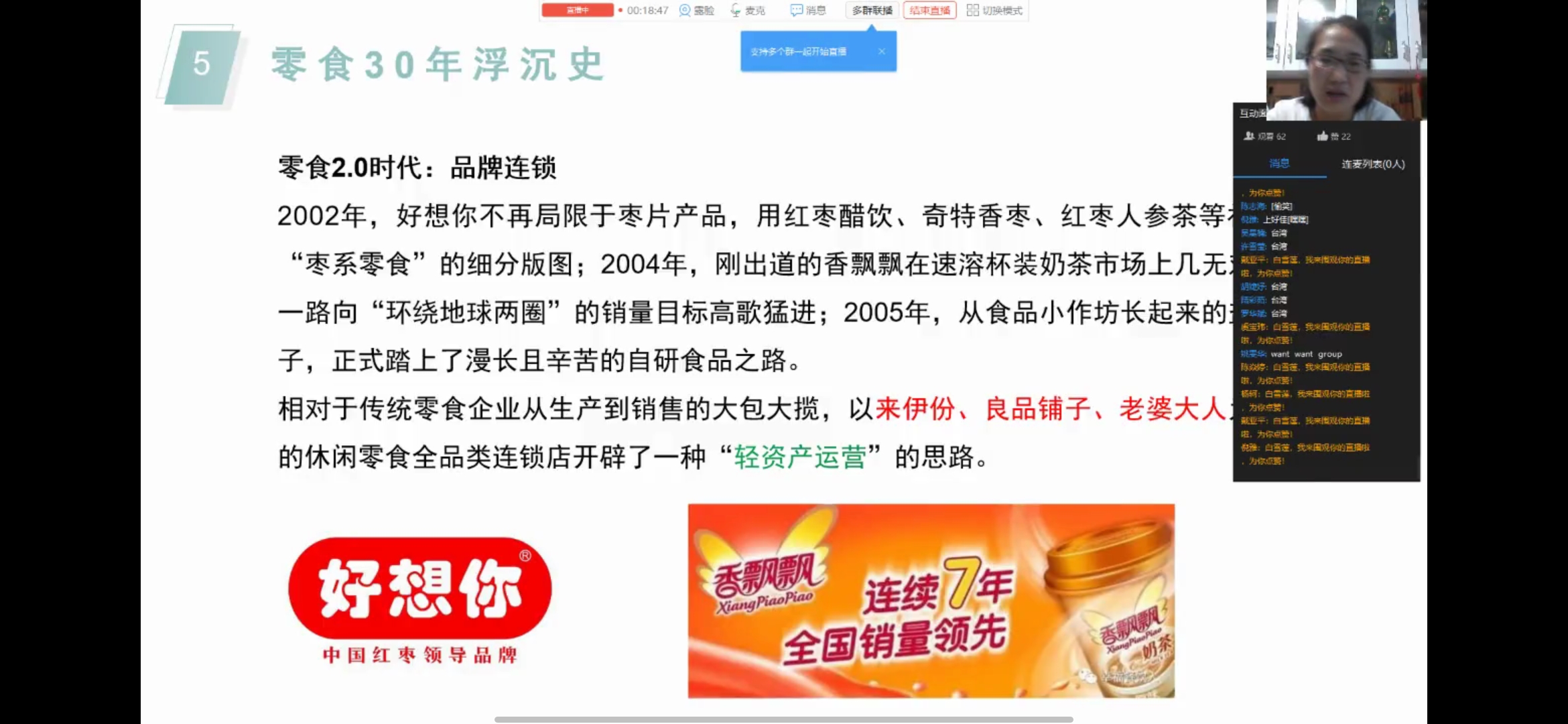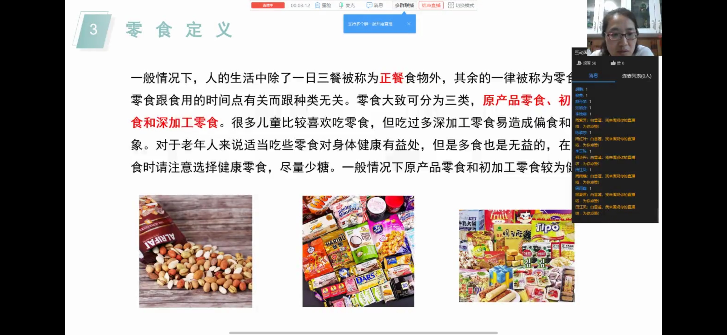 首先,白雪莲老师讲述了零食的定义。一般情况下,人的生活除了一日三餐被称为正餐外,其余的一律被称为零食。零食跟食用的时间点有关而跟种类无关。零食大致可分为三类:原产品零食,初加工零食和深加工零食。然后老师还讲解了零食30年沉浮史,零食1.0代,量大为王。中国第一代零食巨头普遍兴起于上世纪90年代,统一旗下的小当家、小浣熊和旺旺集团的零食产品在休闲食品界风行一时;零食2.0时代,品牌连锁。相对于传统零食企业从生产到销售大包大揽,以来伊份、良品铺子、老婆大人的休闲食品全品类连锁店开辟了一种“轻资产运营”的思路;零食3.0时代,全民线上。百草味在阿里巴巴的力邀下涉足线上,似乎看到了互联网的无限潜力。老师还提到了国内首个“儿童零食”标准:不能含有反式脂肪酸,不能使用经辐射处理的原料,少盐少糖少油,不允许使用防腐剂、人工素色、甜味剂,零食不能蹦到小牙齿,强制标出过敏原等。