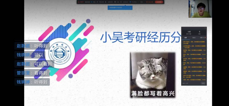 最后,被昆明理工大学录取的刘颖艺同学,她和同学们分享了自己的亲生经历,包括自己考研失败的经历和自己的调剂上岸的经历,并建议同学们最好不要中途换专业,要对初试的每一科都予以重视,在复习时一定要稳住心态扎实复习,在考场中,不要被周围的考生打乱自己的进度,在复试时,整理好自己在本科时的科研经历等,让老师看到自己的闪光点,最后也祝愿同学们能够顺利考研上岸。