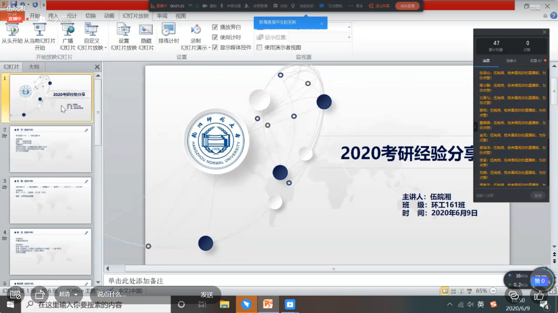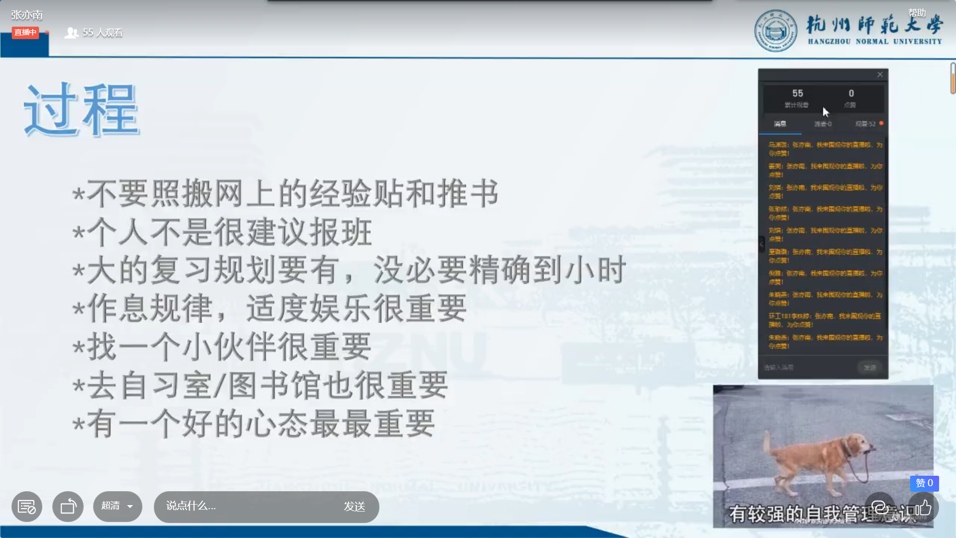 最后,被浙江工商大学录取的连雨露学姐进行直播讲解,对环境工程专业的同学们介绍了考研的基本情况,包括择校、关于专业课的初试经验分享、复试经验的总结。她通过自身情况举例,向同学们讲述了自身志愿填报过程、初试成绩情况、调剂学校、专业以及调剂情况等。她强调政治必须花时间积累,初试结束之后还要继续学习英语,学好数学最重要的是反复与消化,一定要把每个知识点都弄懂。