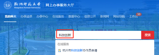1.登录学校网上办事服务大厅://ehall.51hlvip.net/ ,搜索“科技创新”,进入“杭州市科技创新协作员申请”在线服务,按要求填写相关信息,经所在学院、部门初审(负责人可根据51黑料 智慧校园APP待办消息提醒进入审批),由科研院审核汇总报杭州市科技局;