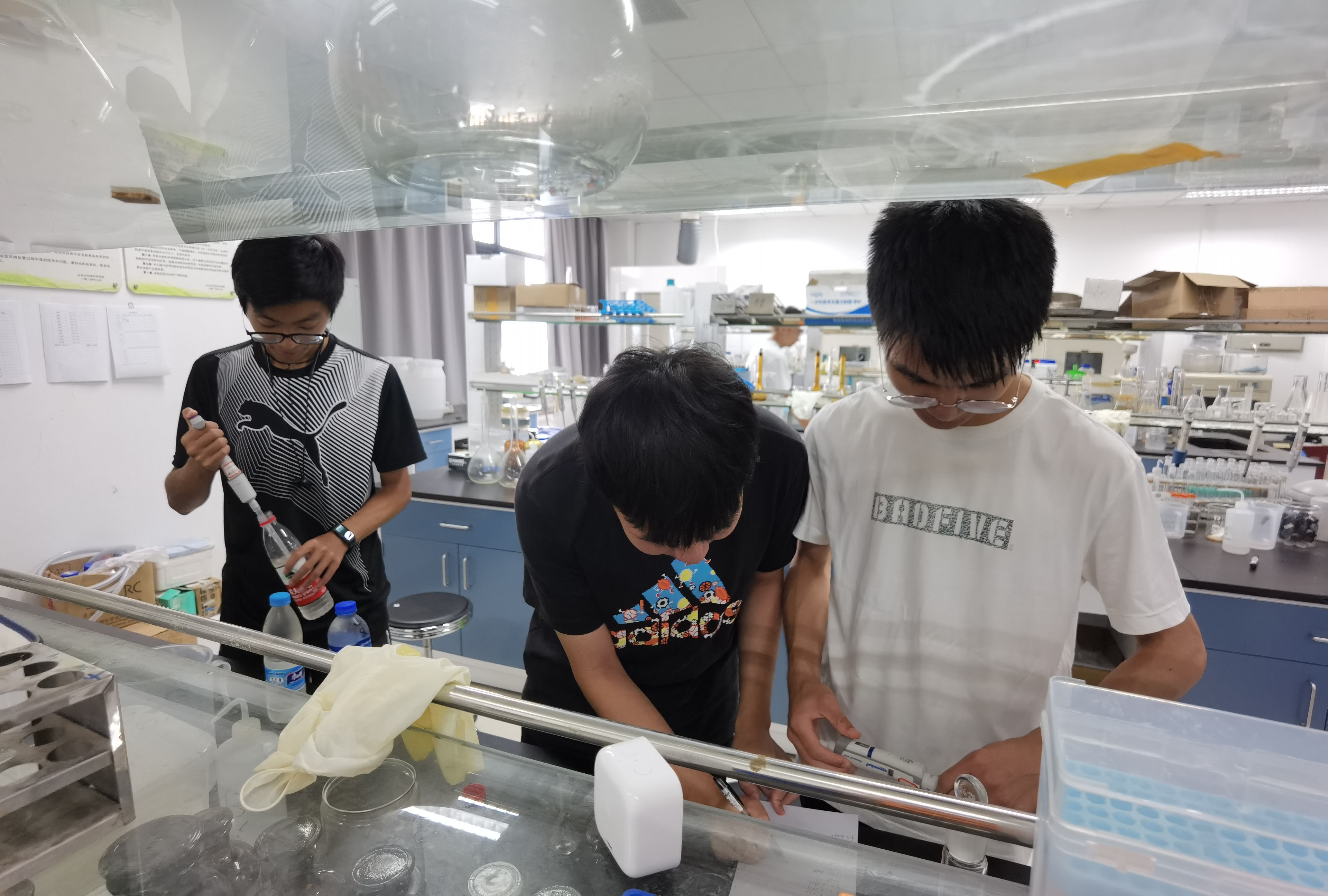 测水样指标的当天,水质检测小分队的成员们三人分为一小组,身着实验服,并戴好了手套,有序地来到了实验室。实验过程中,同学们的动作小心翼翼而井井有条,实验开展有条不紊,整个实验室呈现出一种“忙而不乱”的良好实验氛围。
