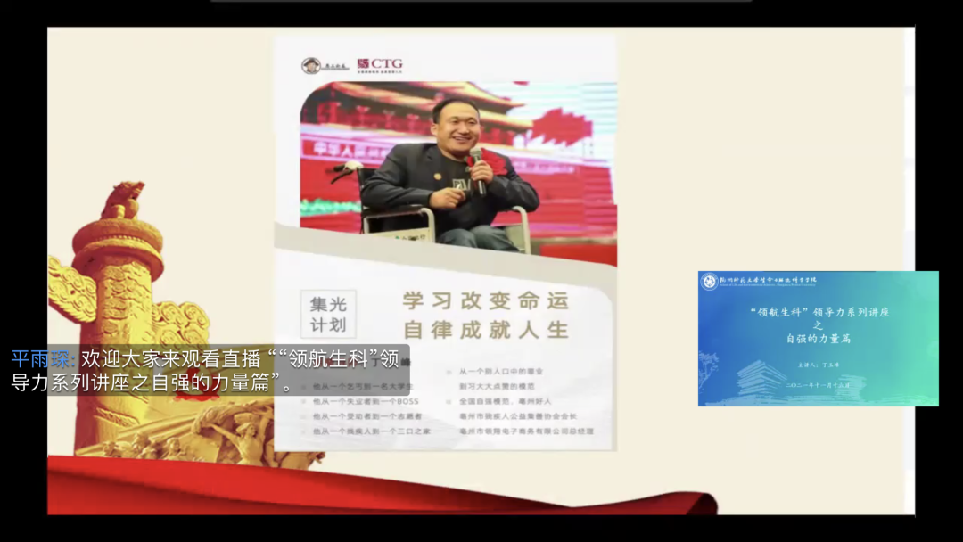 11月16日晚“领航生科“领导力系列讲座之自强的力量在线上顺利开展,21级新生在下沙校区进行线下观看。本次讲座的主题为“强之力,梦之行”,由毫州市残疾人公益集善协会会长、毫州爱心协务常务副会长丁玉峰先生主讲。