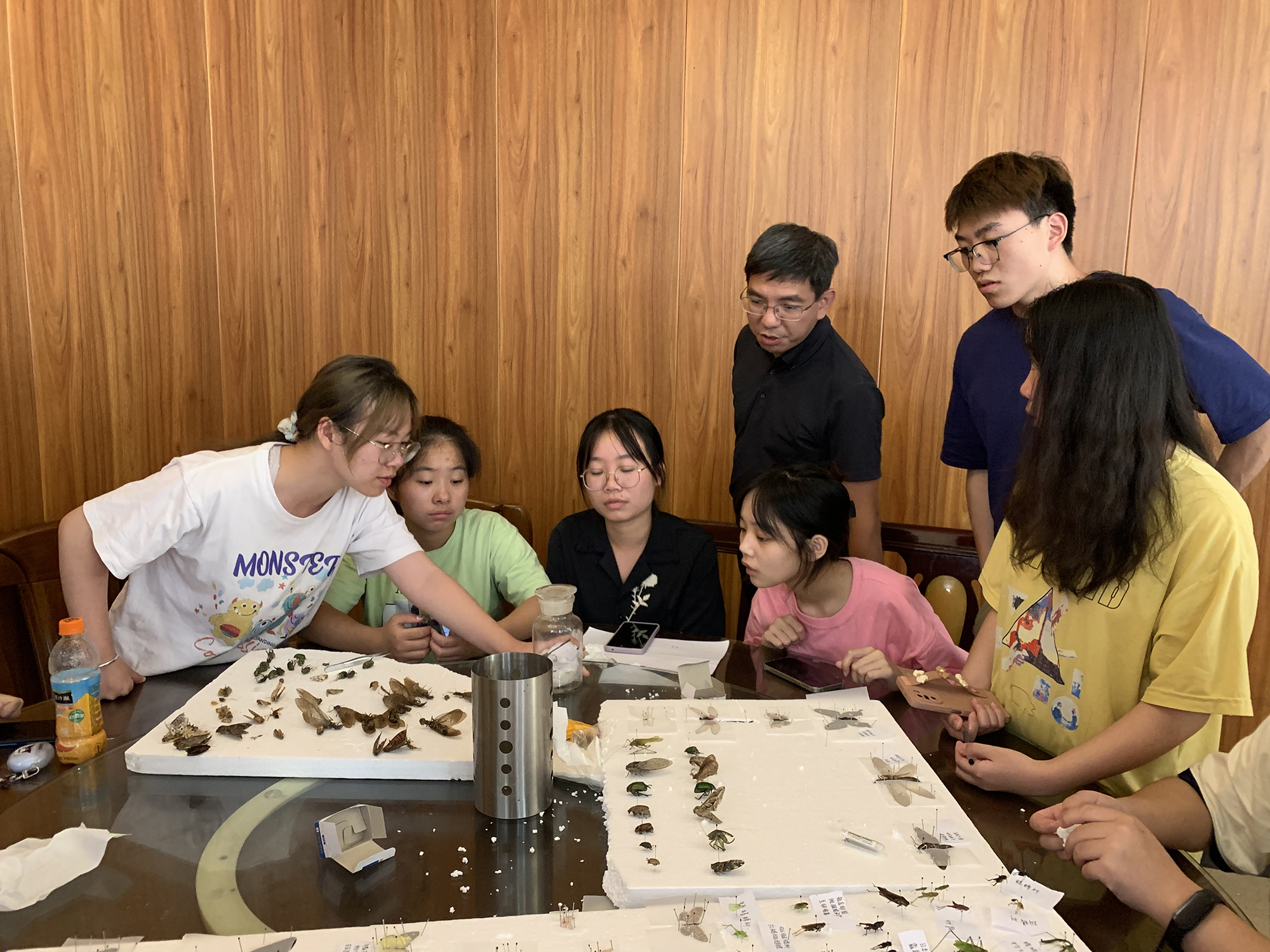 他们一行听取了野外实习指导教师关于本次实习进展情况的汇报,实地了解了学生在实习期间的学习、生活以及安全、饮食等情况,并与同学们一起探讨了实习过程中采集的动植物标本制作流程。