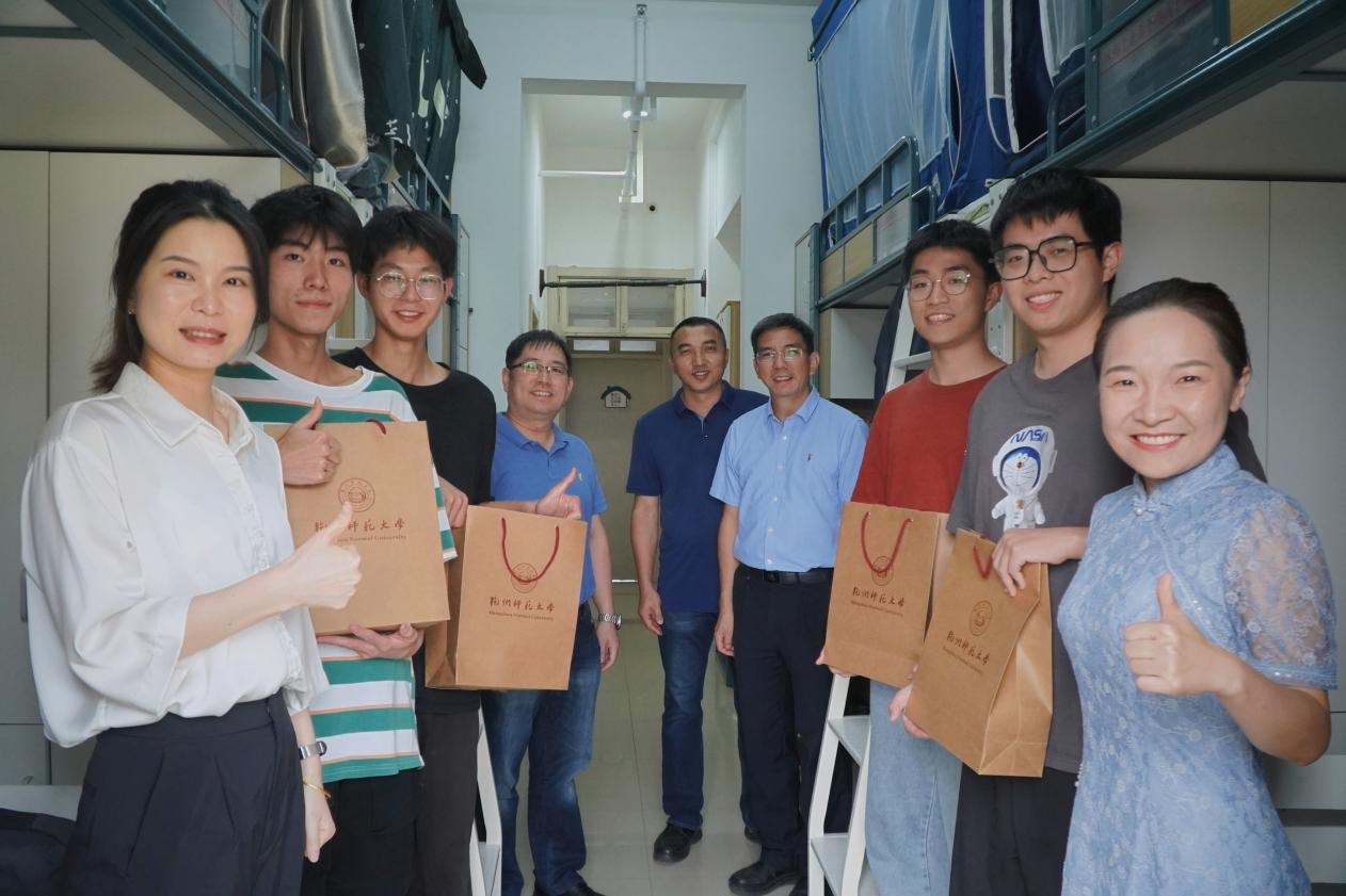 在进学苑学生寝室,学院党政领导班子和同学们进行了亲切交谈,详细询问了同学们的学业和生活近况,征求了同学们对学院的意见建议,并细心叮嘱同学们要注意寝室用电安全等各方面的安全问题,在认真完成学业的同时,勤加锻炼、强健体魄。在与第二学位新生交流获知该生正在备战考研后,学院领导们询问了备考情况以及目标院校,并勉励他勤奋学习、刻苦钻研,争取早日考取理想学府。