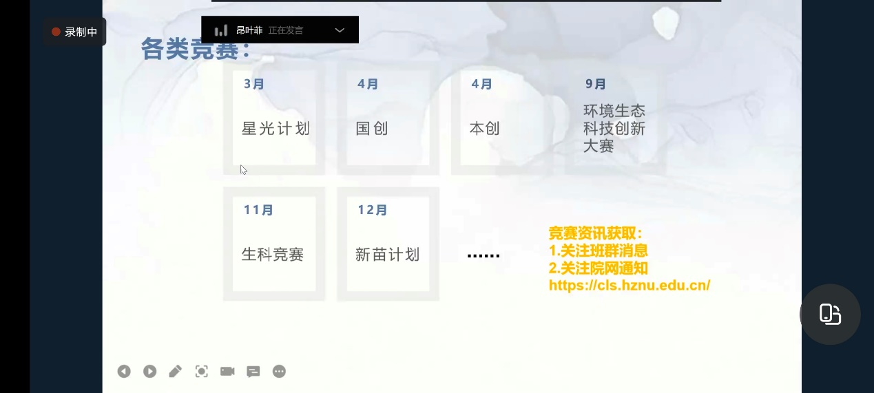 昂叶菲学姐向2022级新生们介绍并分析各类竞赛的时间、难度、含金量以及申报项目的一般流程和相关注意事项,指出新生们可参加的几类竞赛以及了解竞赛信息的渠道。昂叶菲学姐还分享了自己的科研和参赛经历,并给出了自己的建议,鼓励同学们积极主动参加科创比赛。