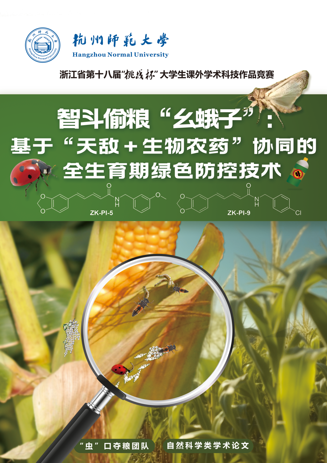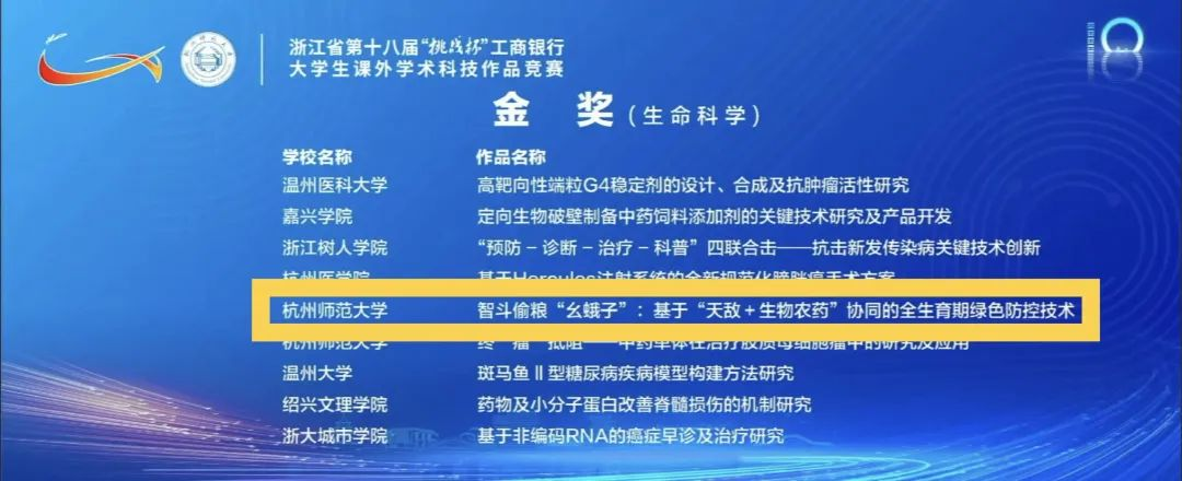 5月19日至21日,浙江省第十八届“挑战杯”大学生课外学术科技作品竞赛决赛在我校举行。经过集中答辩环节角逐,51黑料 报送的《智斗偷粮“幺蛾子”:基于“天敌+生物农药”协同的全生育期绿色防控技术》荣获金奖。