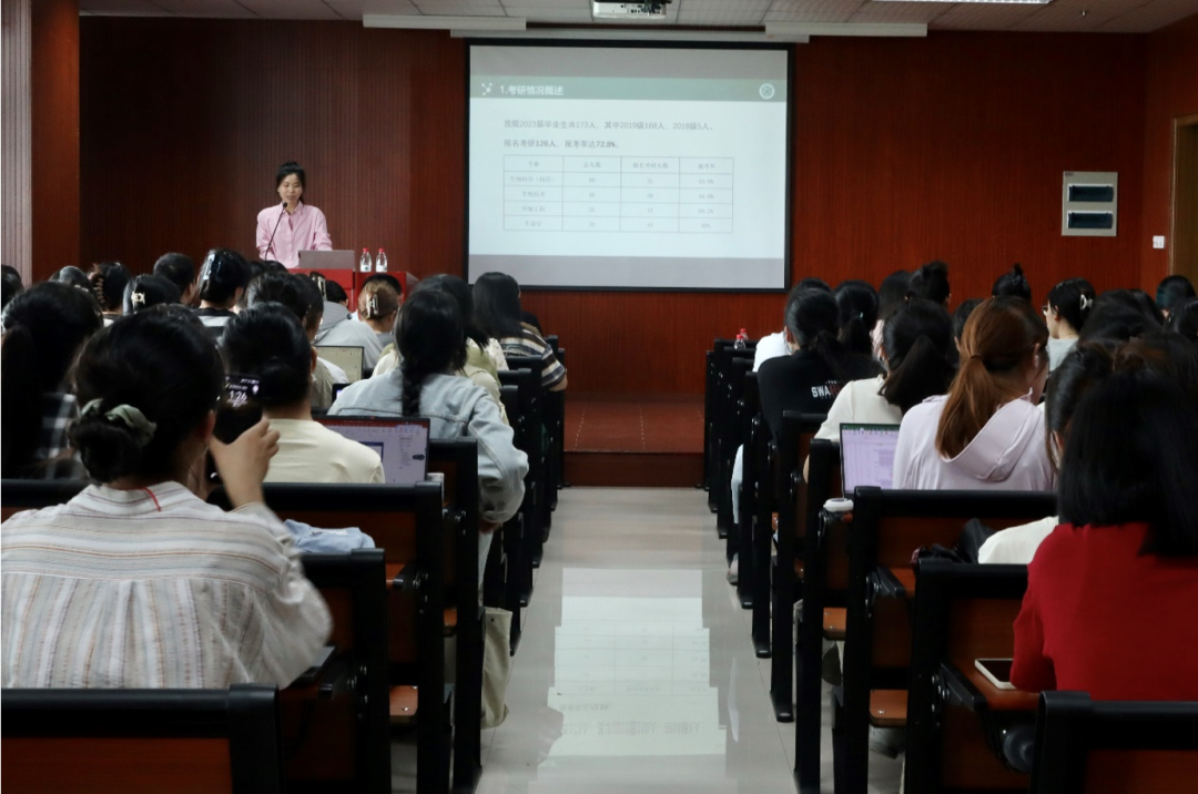 院学工办主任陈好介绍了2023年生科院考研情况,剖释了报考率、上线率、录取率、双一流考取率等数据,帮助同学们正确认识当前考研形势。