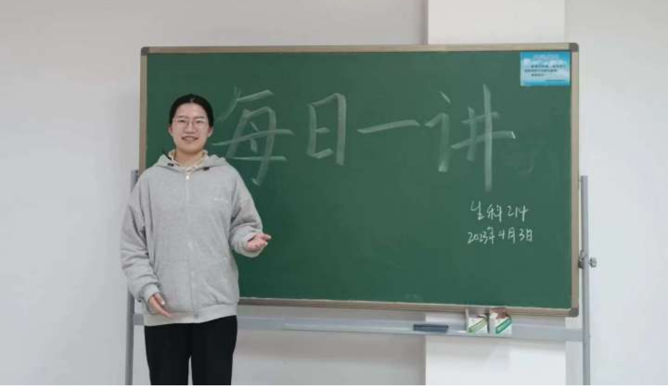 2023年4月6日,生科214班的方文欣以“缅怀先烈,弘扬爱国精神”为主题在班级进行了“每日一讲”活动的主题演讲。
