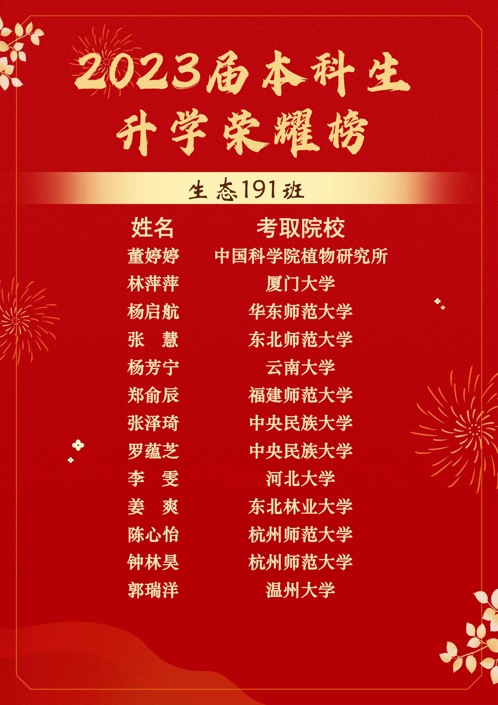 生科院2023届本科毕业生人数共173人,考研报名人数126人,报考率达72.8%,上线人数104人,最终共有88名同学成功被复旦大学、同济大学、厦门大学、西南大学、中科院研究所等院校录取,升学率达50.9%。其中,生物科学(师范)专业35人、生物技术专业27人、生态学专业13人、环境工程专业13人(数据截止至5月31日)。