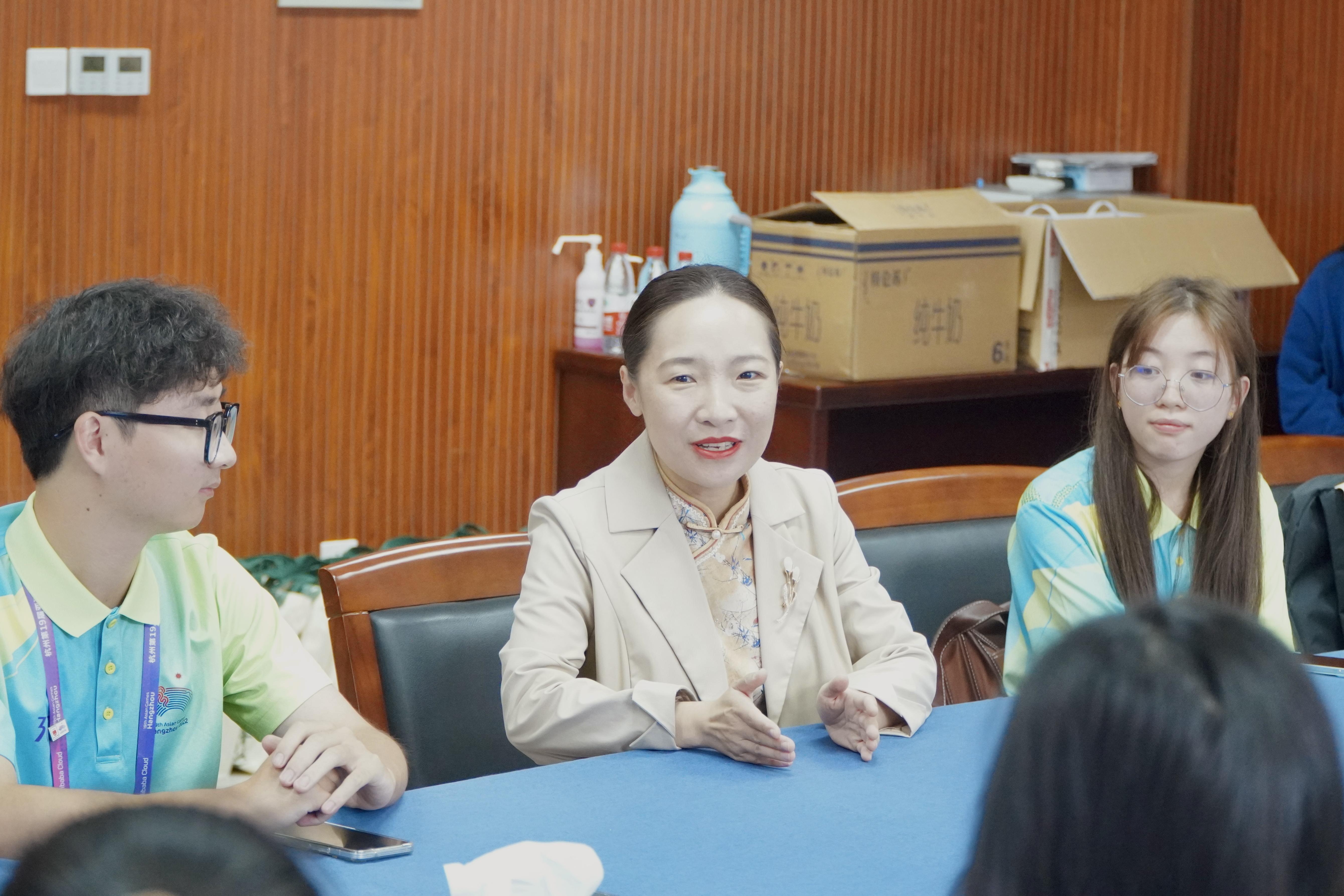 王倩副书记充分肯定学院志愿者与演职同学们的辛勤付出,对师生们在亚运期间的辛苦付出及坚持不懈给予了大大的赞扬,嘱托大家继续鼓足干劲,以优异的风貌和状态继续为志愿活动添光加彩,展示新时代青年的奉献与担当。