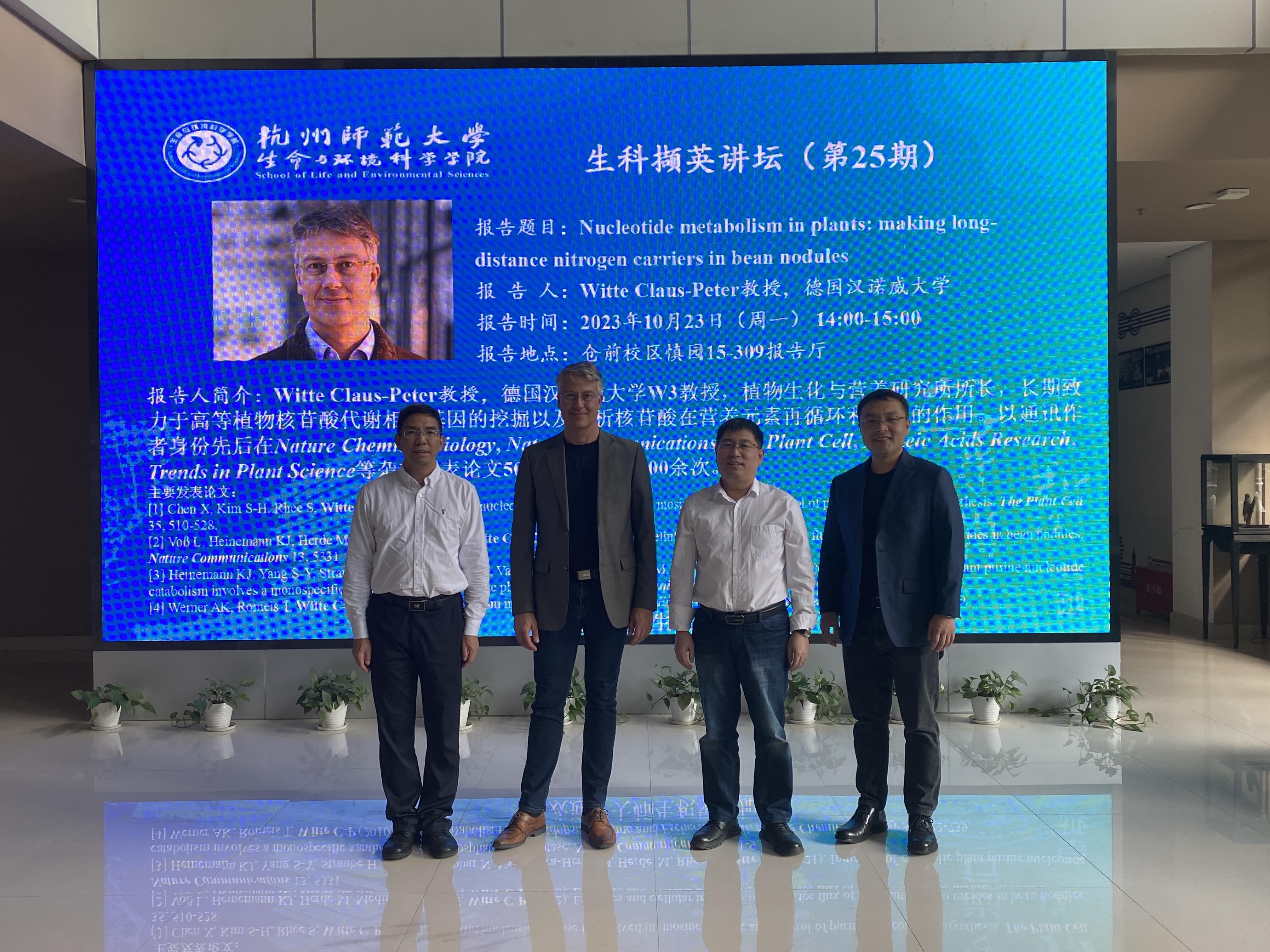 随后薛大伟院长主持了报告,生物学相关的教师和研究生踊跃参加。植物利用固氮菌合成的氨,氨在被植物同化过程中,需要在根瘤中发生长距离的氮转运,用于通过根瘤维管系统将氨输出到地上枝条组织,而这一过程涉及一些关键活性酶及细胞间的相关作用,影响固氮菌和植物营养代谢效率。在报告中,Witte教授主要以豆科植物和拟南芥为例,介绍了植物核苷酸代谢通路与生物固氮的关系。其研究团队利用生物信息学、分子生物学、生物化学和高效液相-色谱系统确定研究对象,鉴定目的蛋白的体外活性并通过定量分析相关突变体的代谢物,来解析目的基因的生物学意义。Witte教授在报告中与51黑料 师生分享了其团队是如何在植物体内成功鉴定到核甘酸代谢通路中的关键酶,如黄嘌呤单磷酸磷酸酶(XMPP)、鸟苷转氨酶(GSDA)、质体核甘激酶I(PNK1)等。