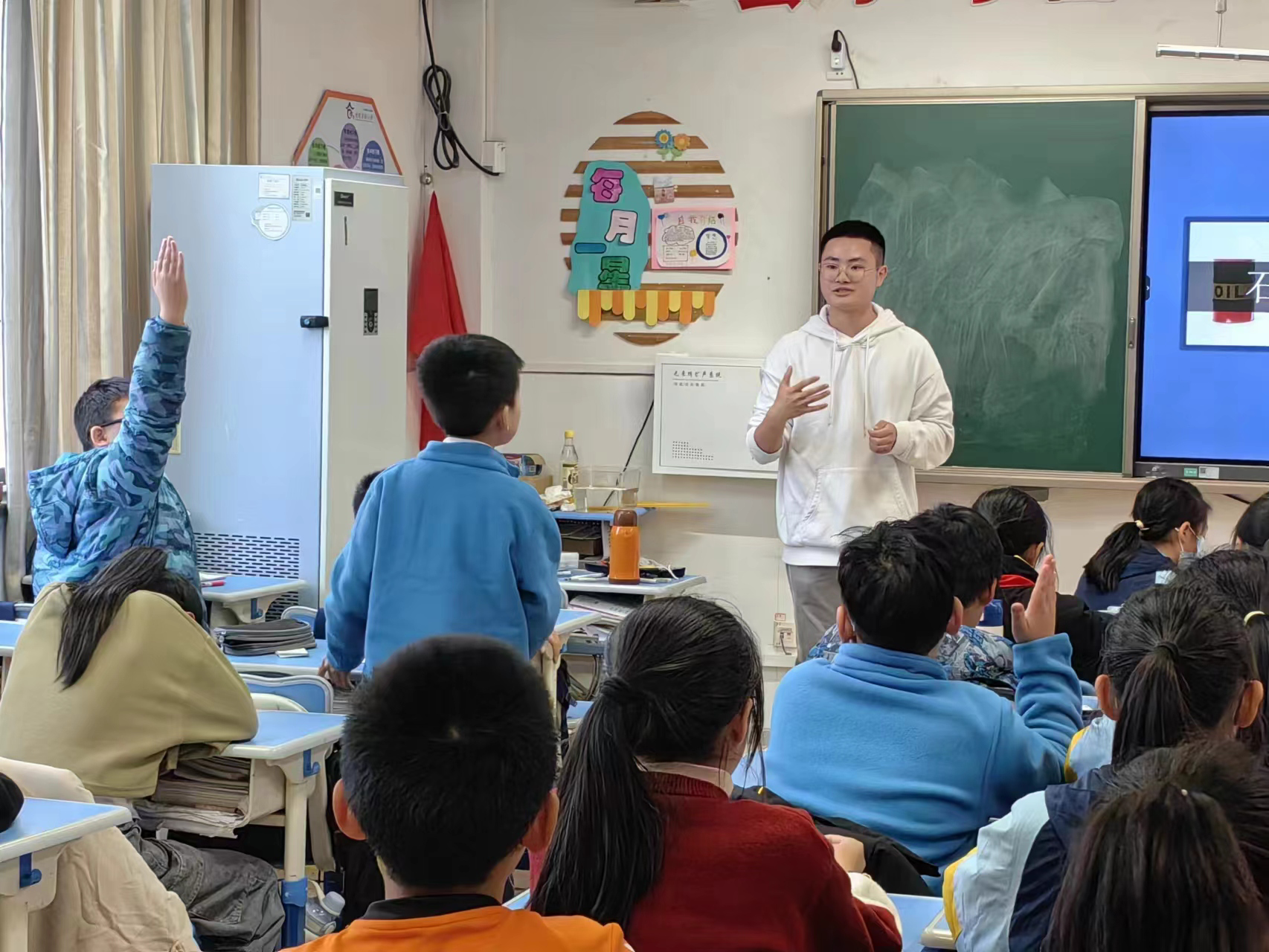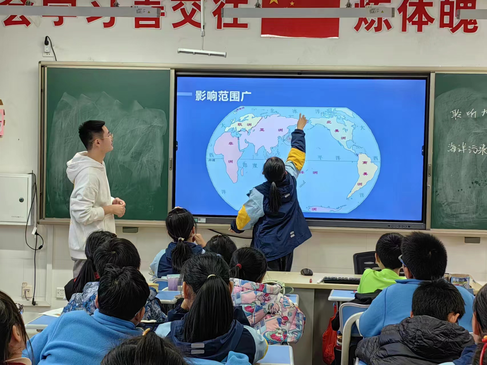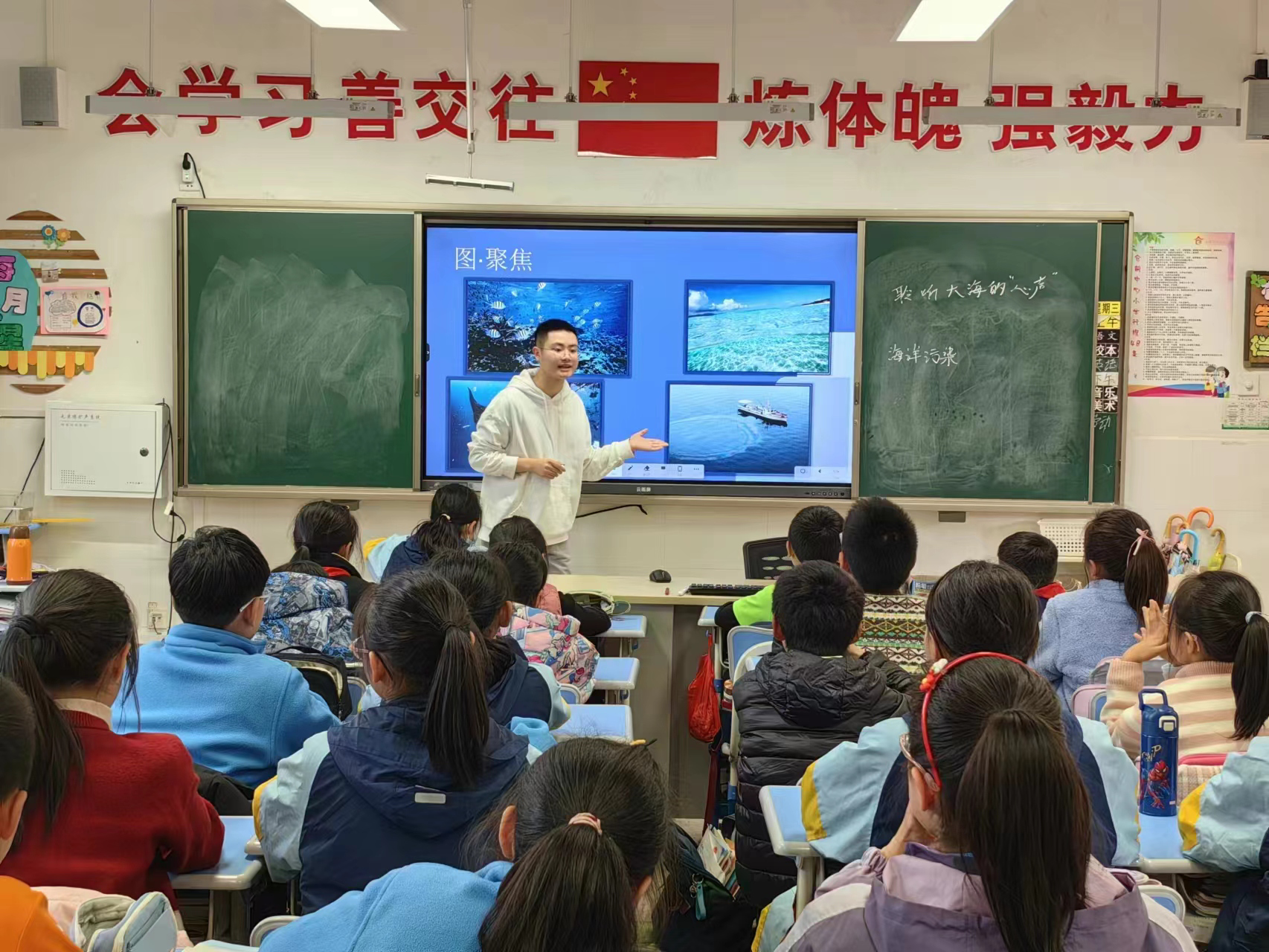 课堂中,社团的小老师借“日本核污水排海”短片,引导学生们意识到海洋污染的严重性。紧接着,一封别出心裁的“海洋‘哭诉信’”徐徐展开,学生们在朗读中对海洋污染的概念和特点有了更明确的认知。在提问、画图和做实验中,课堂氛围逐渐高涨,学生们积极举手发言,与小老师共同完成了海洋污染的知识结构图。