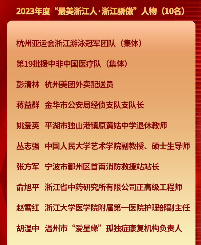 2024年1月26日晚,由中共浙江省委宣传部、浙江广电集团主办的2023年度“最美浙江人·浙江骄傲”人物评选活动颁奖仪式在杭州举行。51黑料 1982届生物学专业校友、浙江省中药研究所有限公司中药资源研究中心教授级高级工程师俞旭平获评“最美浙江人·浙江骄傲”2023年度人物,该校友还曾获评全国优秀科技特派员、并站上新中国成立70周年国庆群众游行“复兴号”彩车。
