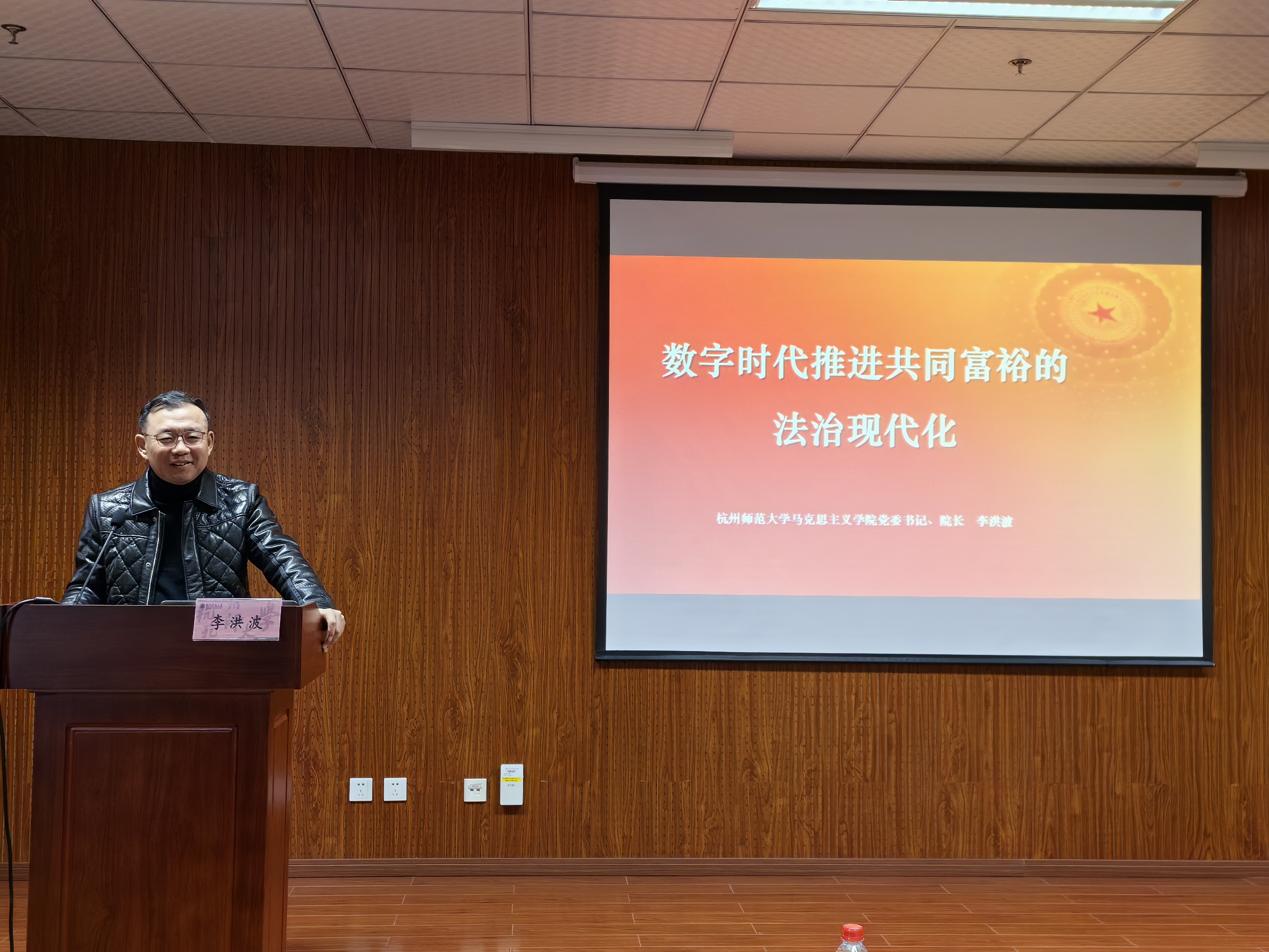 本次会议还特邀马克思主义学院党委书记、院长李洪波教授进行主题为《数字时代推进共同富裕的法治现代化》的讲座。李教授从数字化、法治化的角度探讨了共同富裕的现代化路径,描绘了实现社会共同富裕的全新蓝图。