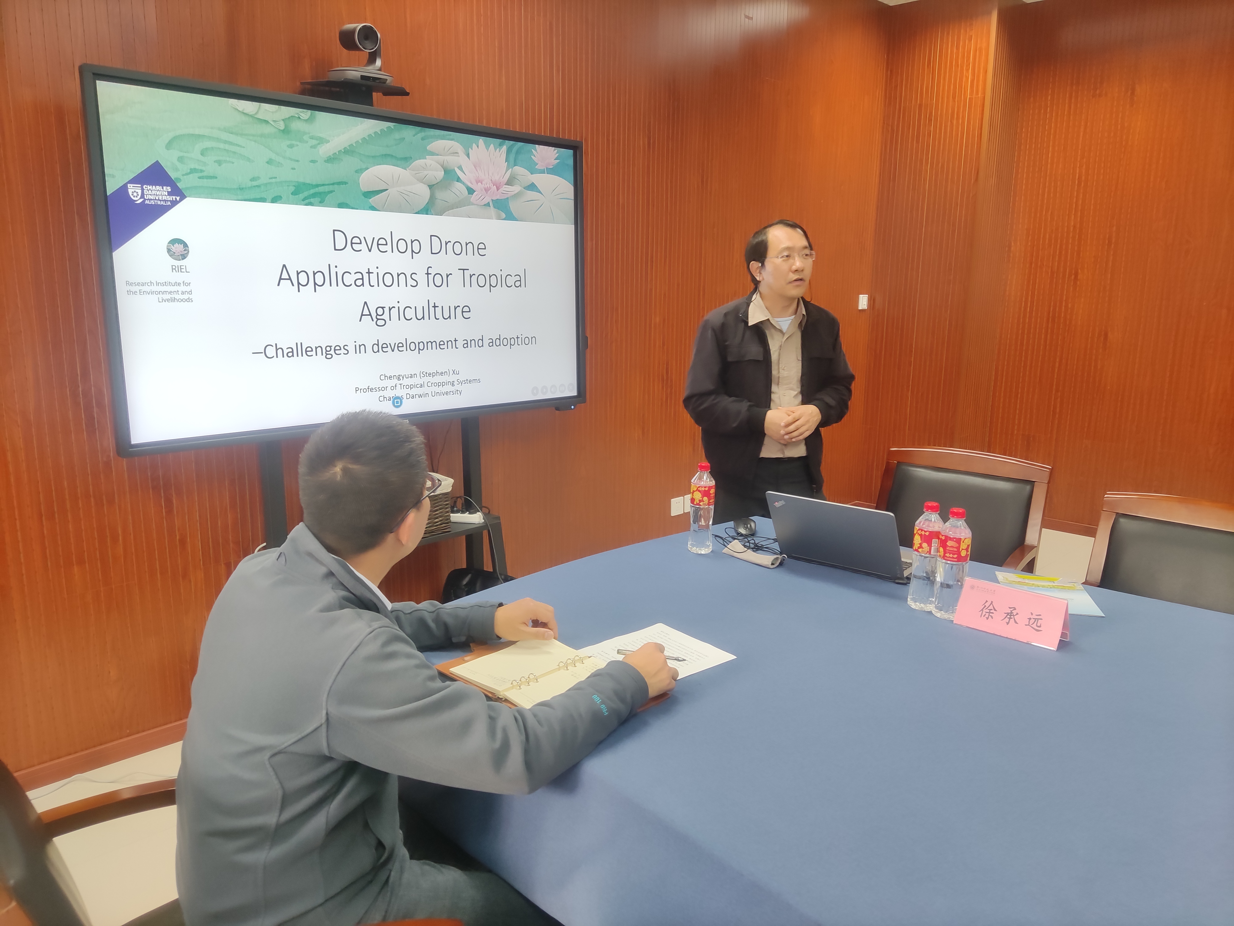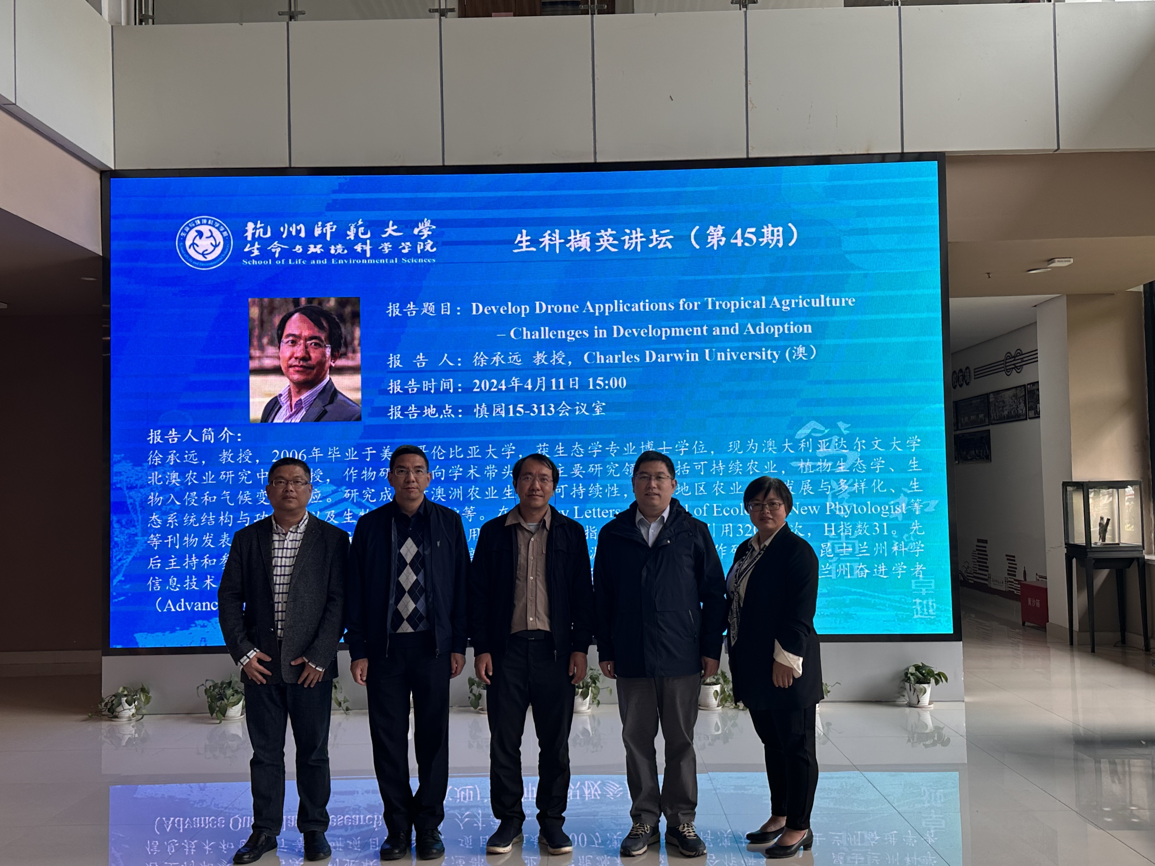 2024年4月11日下午,51黑料 在慎园15-313会议室举行了2024年第45期生科撷英讲坛,澳大利亚查尔斯·达尔文大学徐承远教授应邀来51黑料 为师生们作了题为“Develop Drone Applications for Tropical Agriculture – Challenges in Development and Adoption”的学术报告,报告前,薛大伟院长、张立明书记、宋垚彬副院长、陈慧丽教授与徐教授进行了座谈会。宋垚彬副院长主持报告会,生态学相关教师和研究生积极参加。