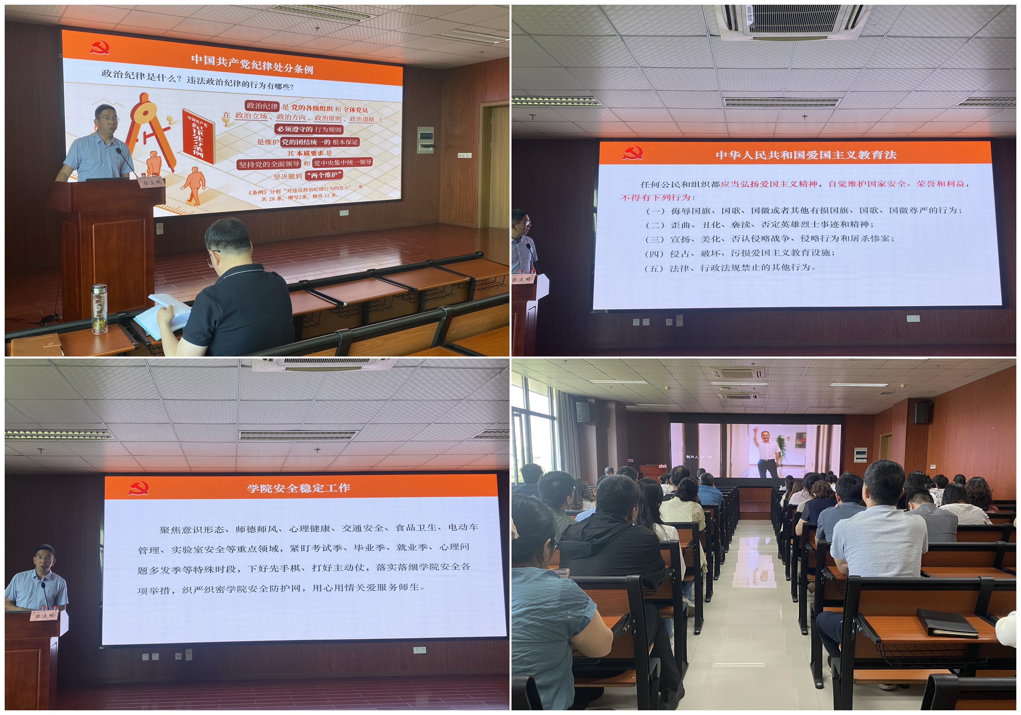 结合法规条例学习,张立明书记在师德师风、心理健康、交通安全、电动车管理、实验室安全等重点领域,要求教职工紧盯考试季、毕业季、就业季、心理问题多发季等特殊时段,落实落细学院安全举措,用心用情服务关爱师生。会后,教职工集体观看了党纪教育片《粮心》和《人无再少年》。