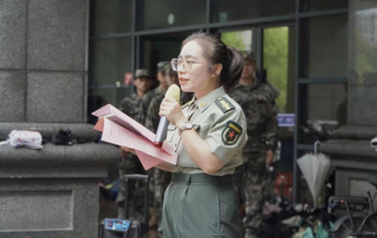季超群老师介绍了军训的相关事宜,包括场地、安全等事项。在全场高唱国歌之后,由学生代杨柳依同学进行发言。她代表23级学生表示将会以饱满的热情与昂扬的斗志投入到每一项任务中去。大会还邀请了一团四营一连连长尚泓懿作为教官代表发言。教官对于未来十四天的军训作出了总的要求,并表明圆满完成本次军训任务的信心。
