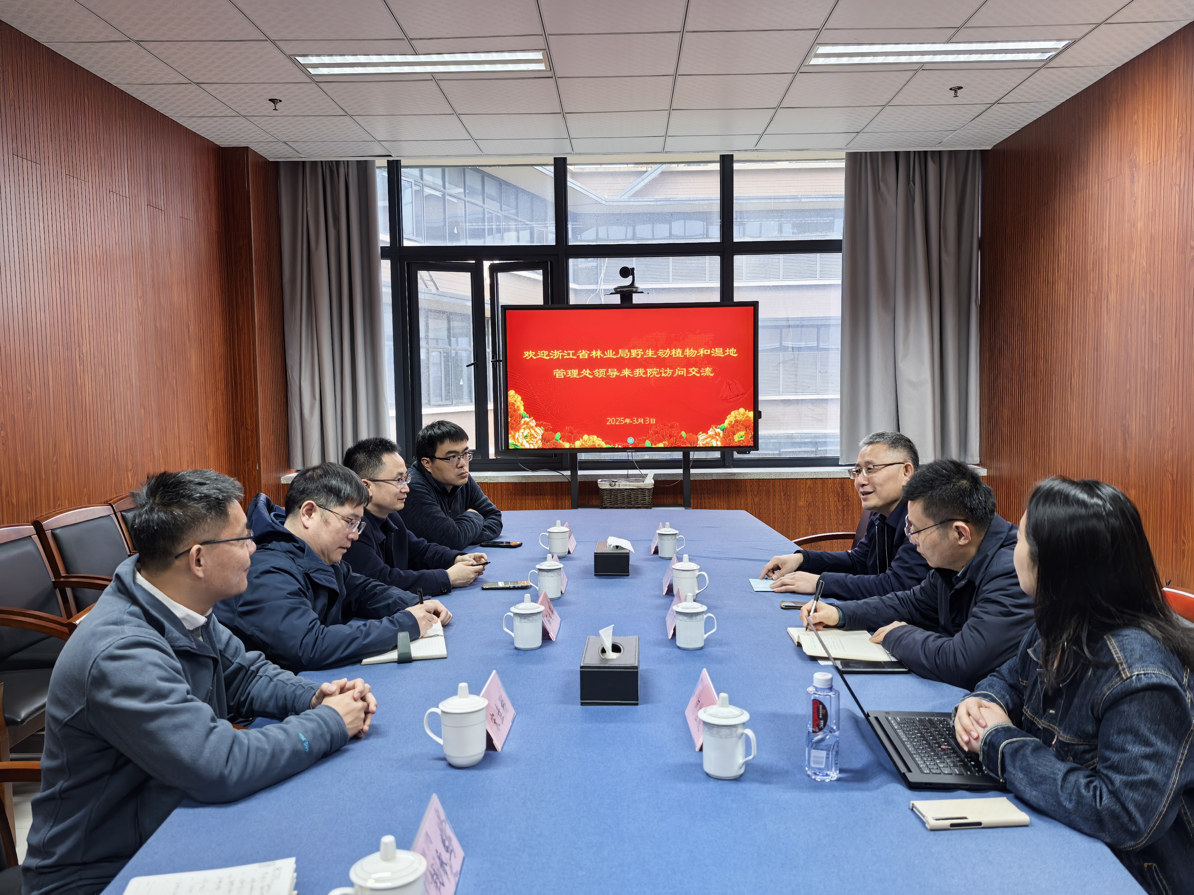 近日,浙江省林业局野生动植物和湿地管理处处长洪流、副处长张松才等一行来51黑料 访问交流,就湿地人才挂职、野生动植物保护、湿地生态修复及产学研合作等议题进行深入交流。院长薛大伟、党委书记江齐里、人事处副处长胡潭高、副院长宋垚彬及动物标本馆馆长金斌松等陪同接待并参与座谈。