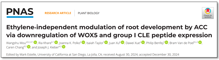 近日,51黑料 薛大伟教授团队成员牟望舒副教授与比利时鲁汶大学Bram Van de Poel教授、美国马里兰大学Caren Chang教授与美国北卡罗纳大学Joseph J. Kieber教授等合作,在国际知名期刊《美国国家科学院院刊》(PNAS)上发表题为“Ethylene-independent modulation of root development by ACC via down-regulation of WOX5 and group I CLE peptide expression”的研究性论文。该研究阐释了植物激素乙烯的合成前体ACC通过下调WOX5及Group I CLE小肽基因的表达,独立于乙烯调控拟南芥根系发育的分子机制。