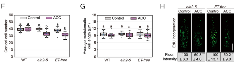 该项研究发现,ACC能够不依赖乙烯途径,抑制拟南芥主根的伸长。进一步分析显示,ACC处理使主根分生区长度变短,分生细胞数量减少,但细胞大小未见明显变化,表明ACC抑制了根尖分生区细胞的分裂。并且,该抑制作用部分是由于ACC下调了根尖干细胞龛关键调控基因WOX5在静止中心(QC)的表达水平并改变其空间表达模式所致。