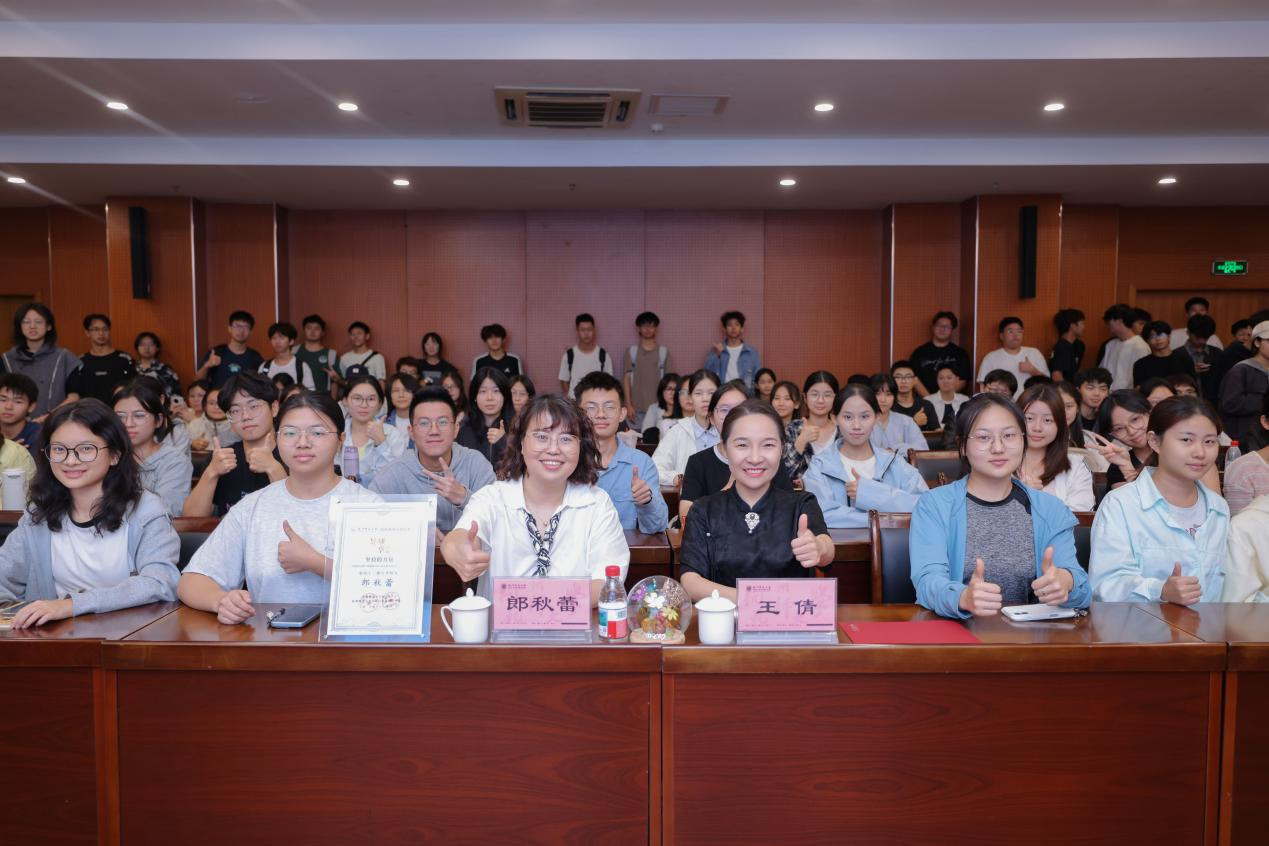 在互动环节,现场学生踊跃发言、积极提问,问题涵盖专业学习、创业选择及时间平衡等多个方面。针对这些提问,郎秋蕾一一回应并结合实际展开细致解答:她认为,若过度纠结未来,反而容易引发焦虑,建议先确定好大方向,再踏实做好每一步;并表示“自洽”是最好的状态,要学会与自己和解。同时,她提议同学们听从内心想法,静下心思考当下正在做的事,明确自身目标,以良好的精神状态积极面对未来的不确定性与挑战。此外,她还提醒同学们不要“内耗”——不纠结过去、不焦虑未来,专注当下,朝着目标持续坚持。