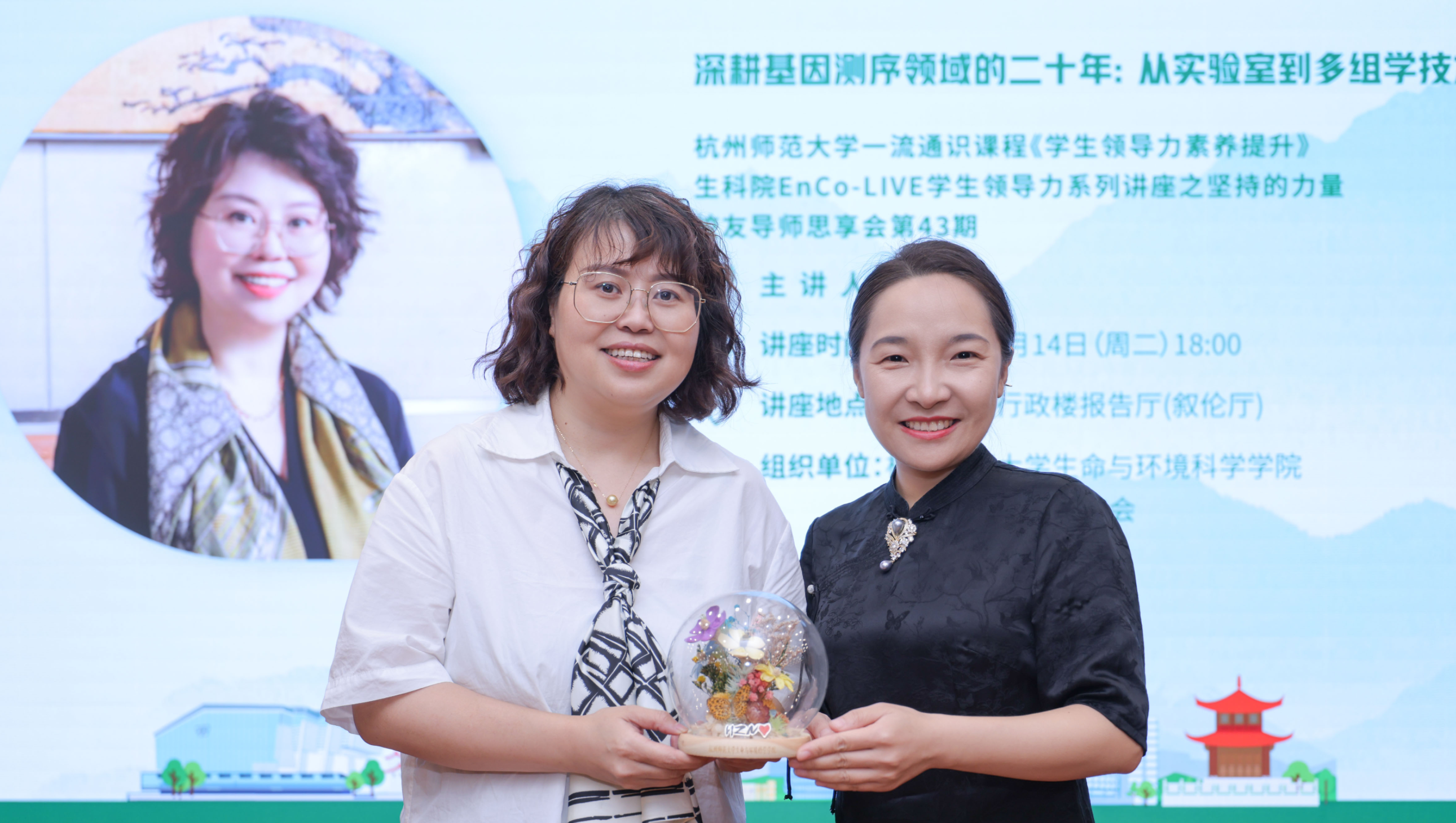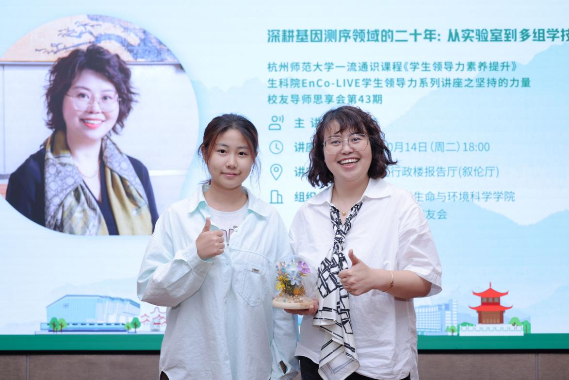 现场还进行了杭师大生科院“EnCo-LIVE学生领导力素养提升计划”导师及就业创业导师聘任仪式,生科院党委副书记王倩为郎秋蕾颁发聘书及“校友导师思享会”纪念牌,学生代表为其送上生科院学生制作的“永生花”摆件,并合影留念。